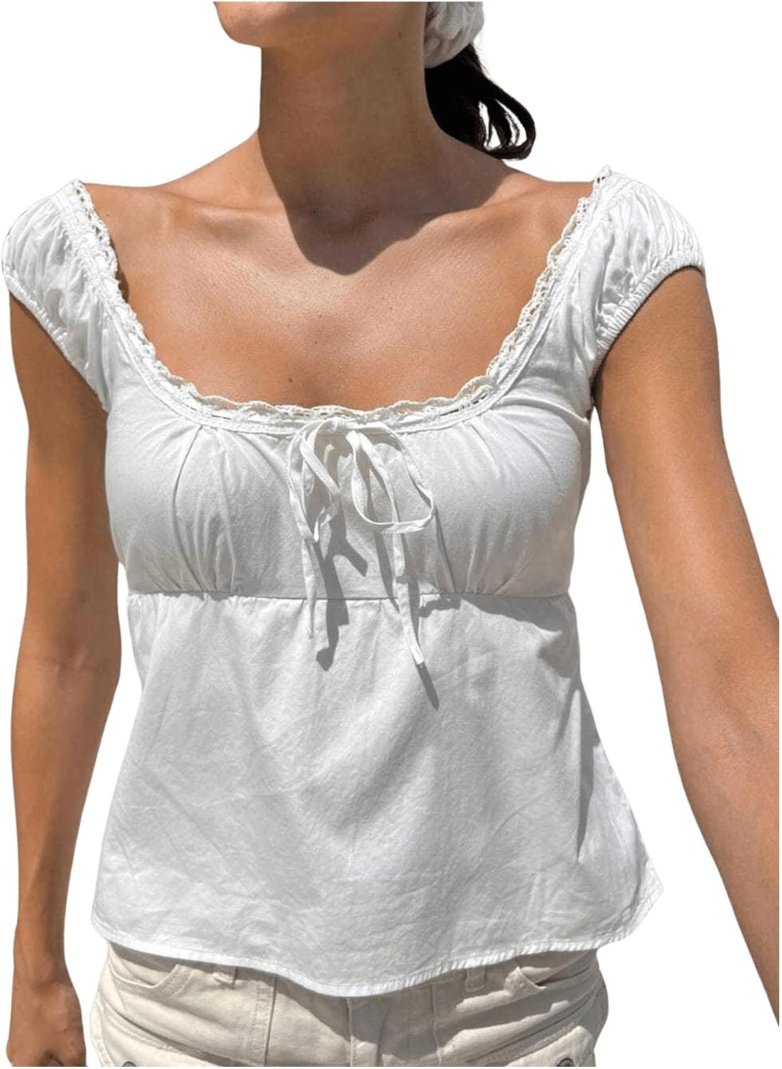 SweatyRocks Women's Tie Front Lace Blouse Square Neck Cap Sleeve Summer Peplum Tops