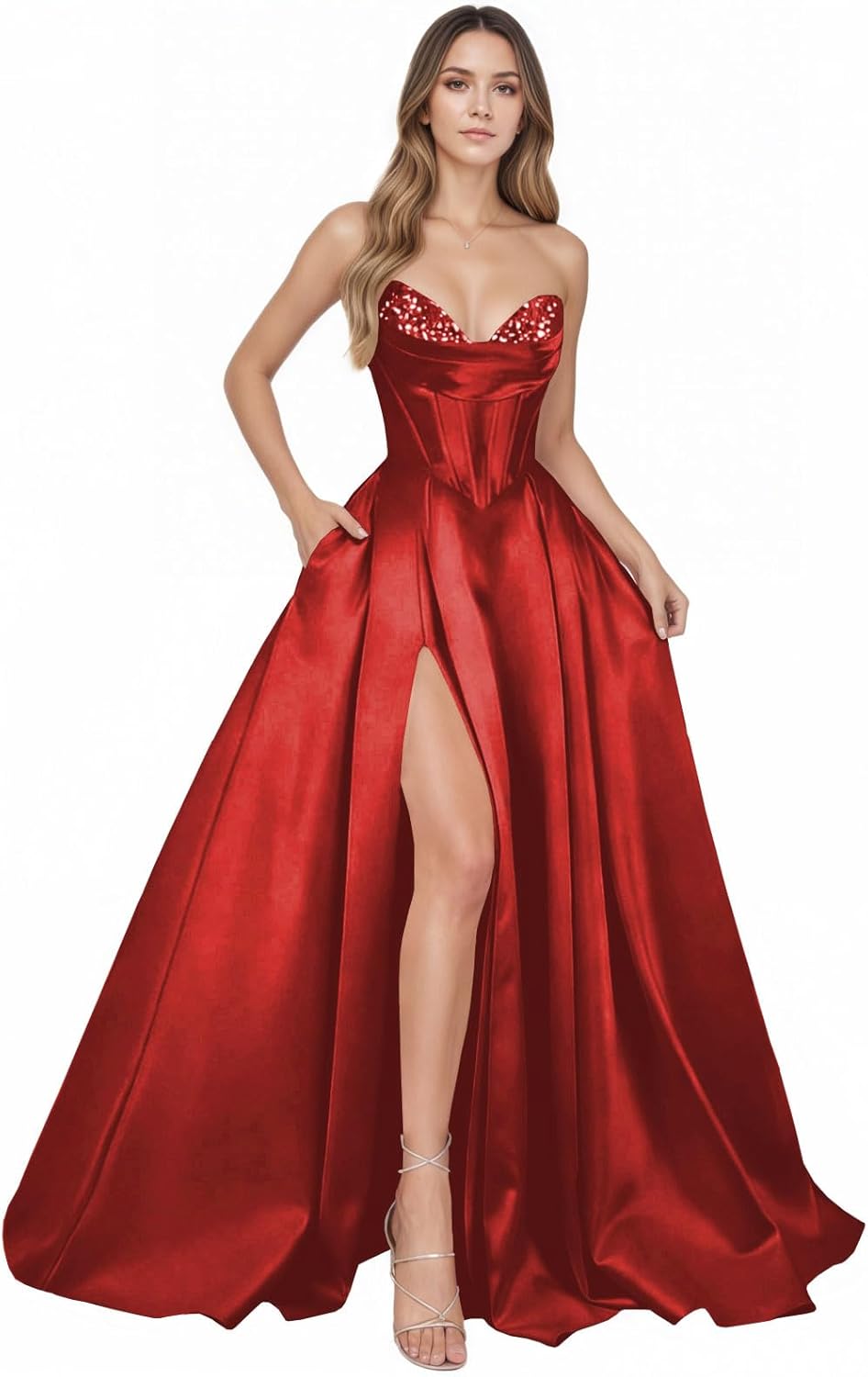 AKMESXAY Strapless Sequin Prom Dresses Long with Slit Corset Satin Formal Party Dress AS015