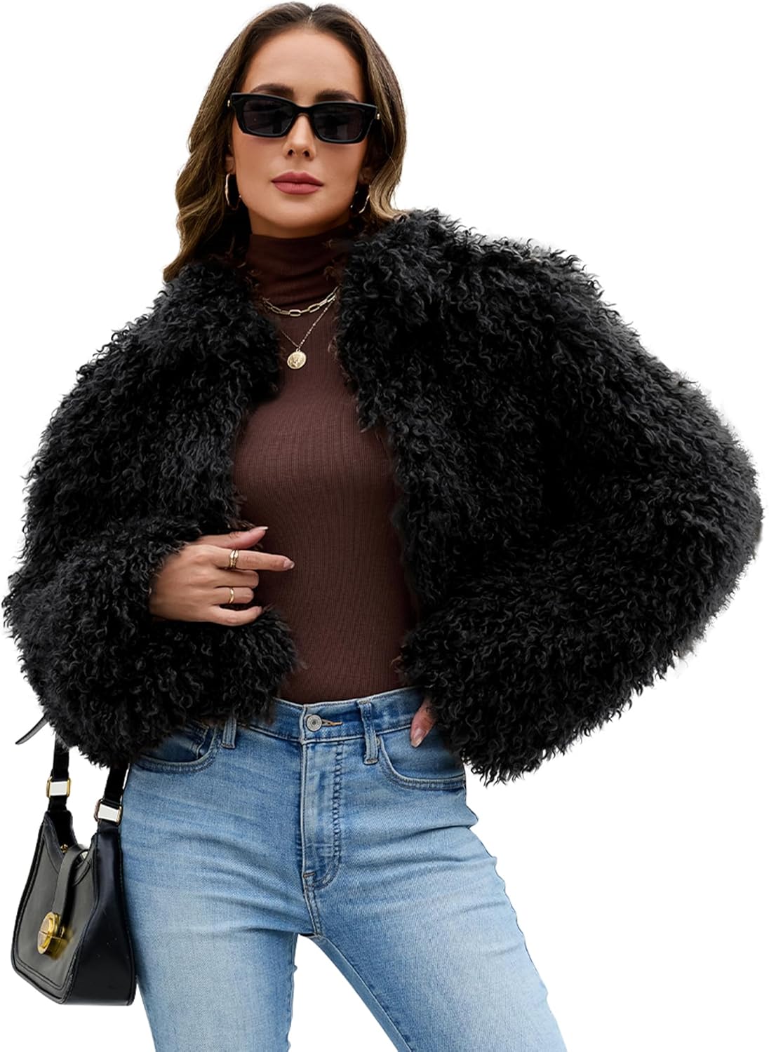 Womens Faux Fur Cropped Coats Fuzzy Long Sleeve Stand Collar Winter Jacket Open Front Cardigan Top Fluffy Warm Outwear