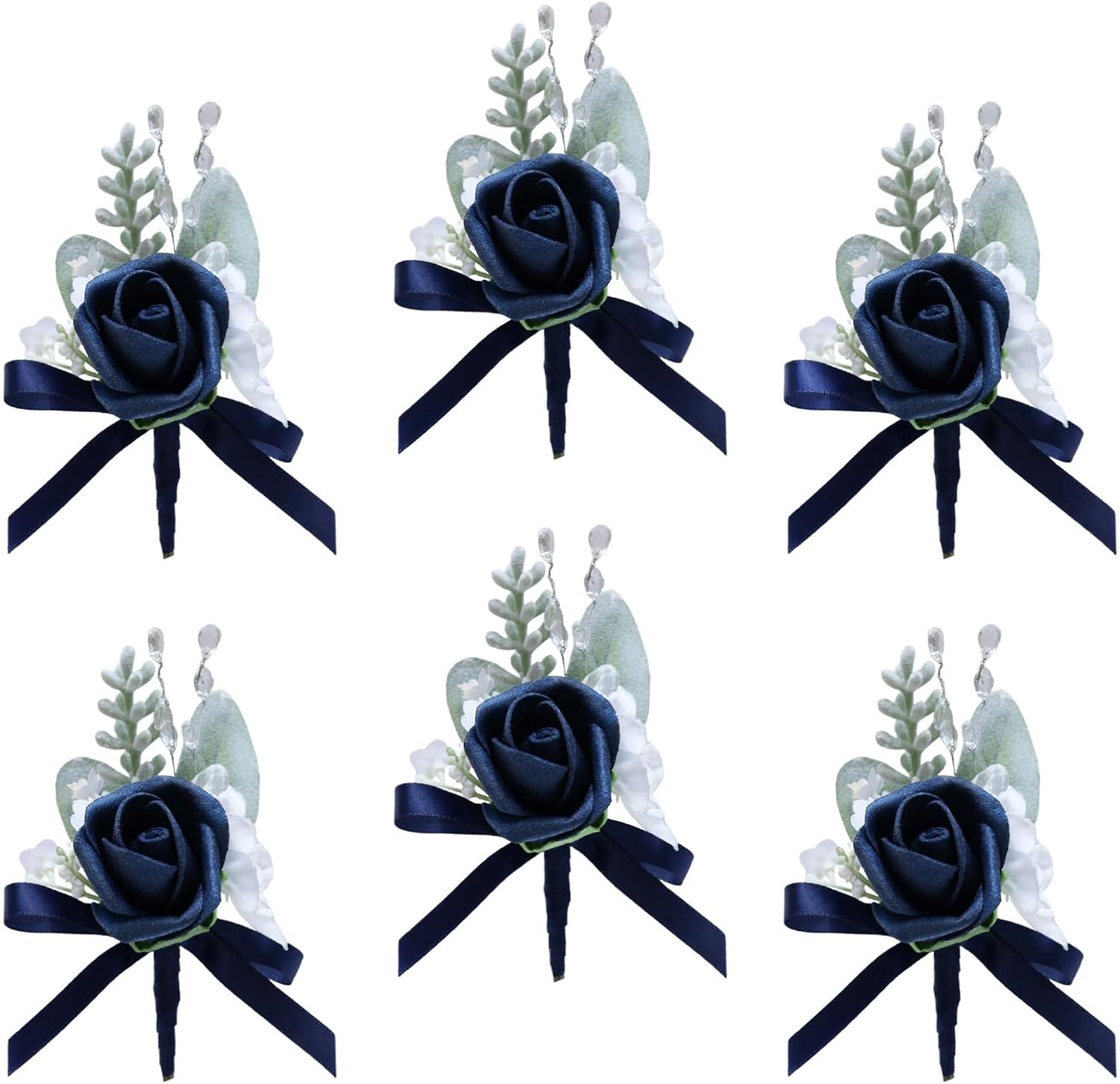 Marriwise 6pcs Rose Boutonniere for Men, Artificial Flowers Wedding Groom Groomsmen Boutonniere for Wedding/Anniversary/Prom/Rustic Wedding/Homecoming (Dark Navy Blue)