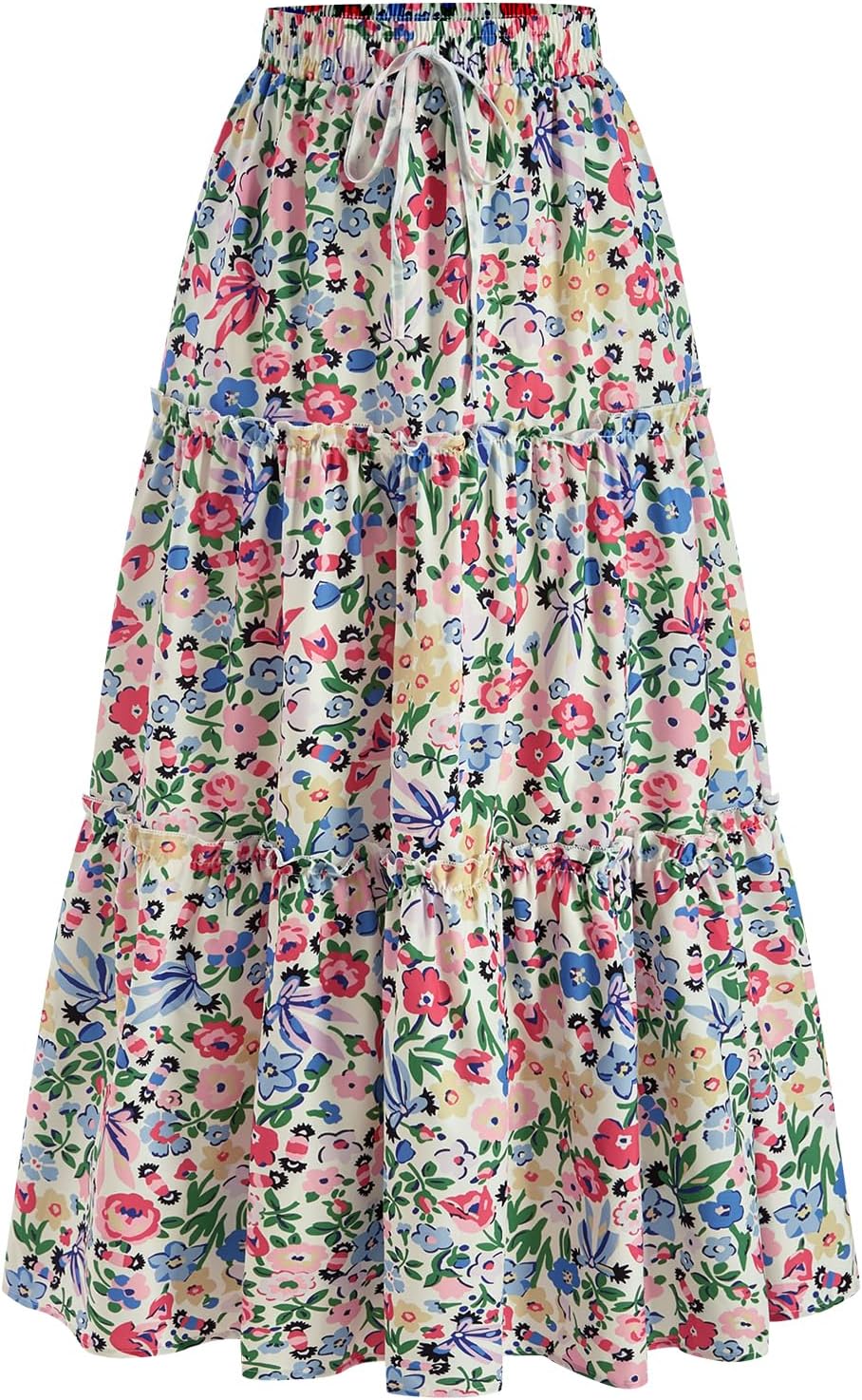 Women's Boho Floral Tiered Ruffle Maxi Skirt High Waisted Flowy Beach Vacation Skirts with Pockets