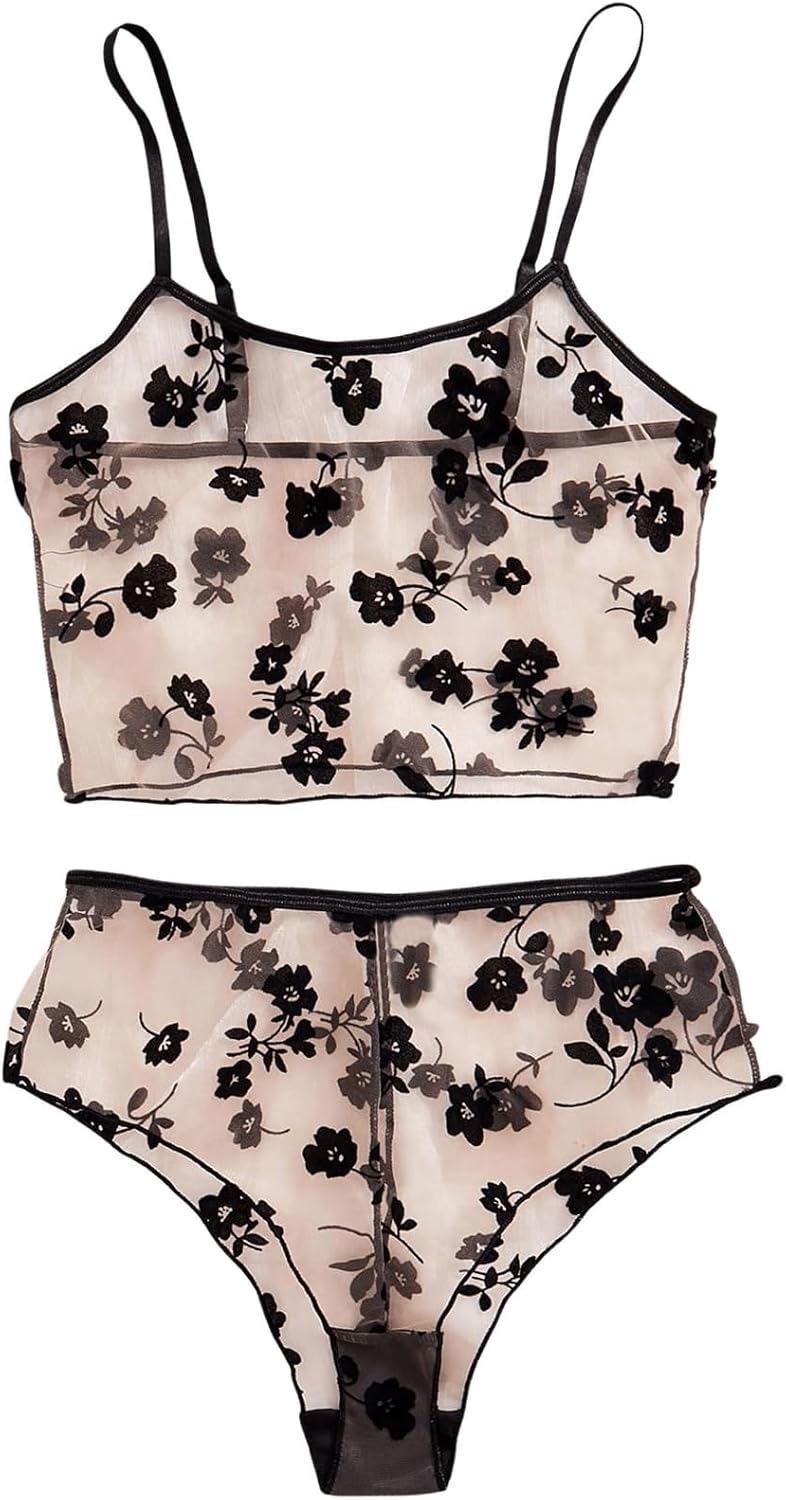 SOLY HUX Women's Lingeries Floral Mesh Sheer Matching Bra and Panty Set Boudoir Outfits Nightwear 2 Piece