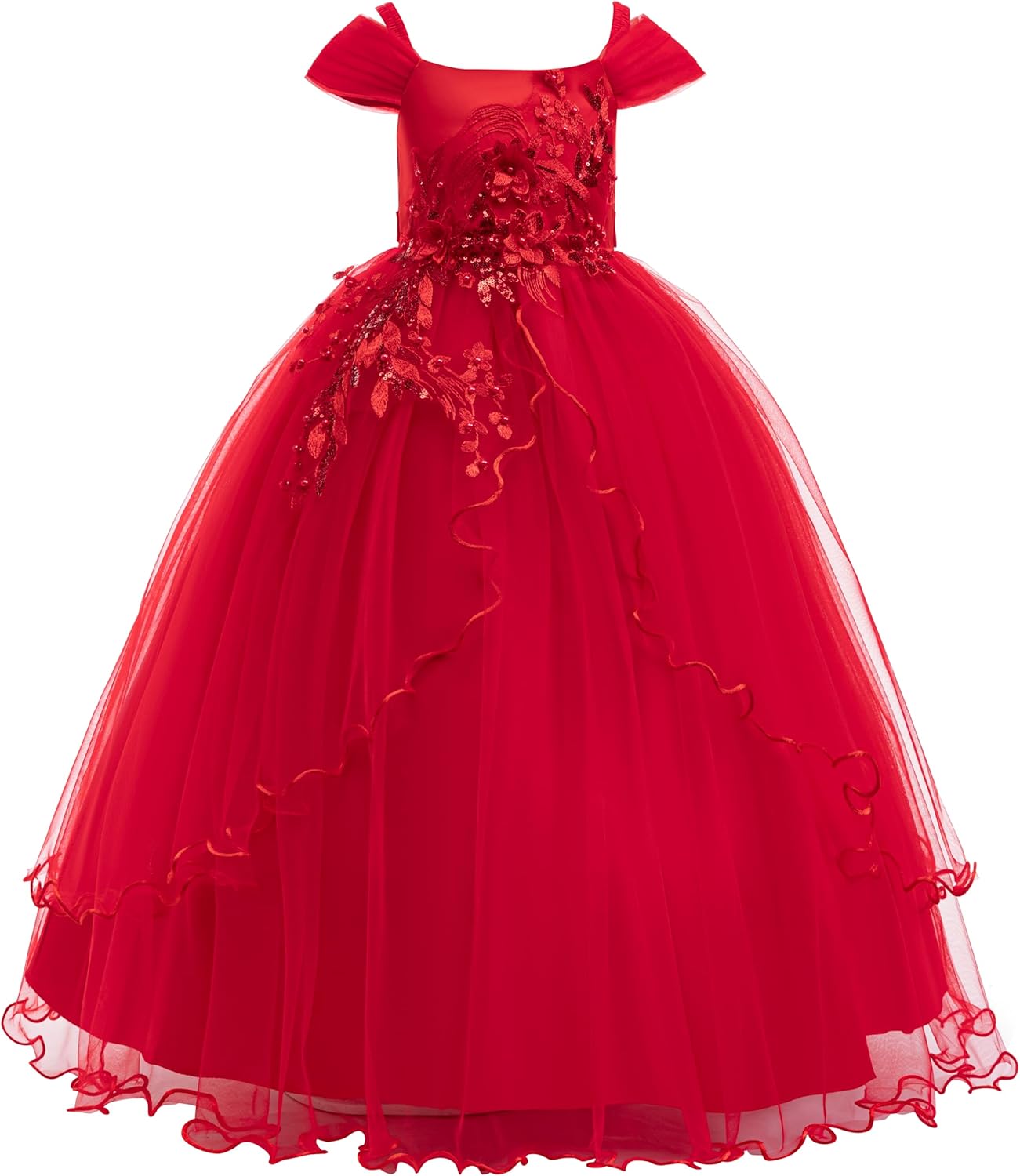 Weileenice Vintage Off The Shoulder Flower Girl Dress Lace Embroidery Little/Big Girls Wedding Bridesmaid Holiday Ballgown