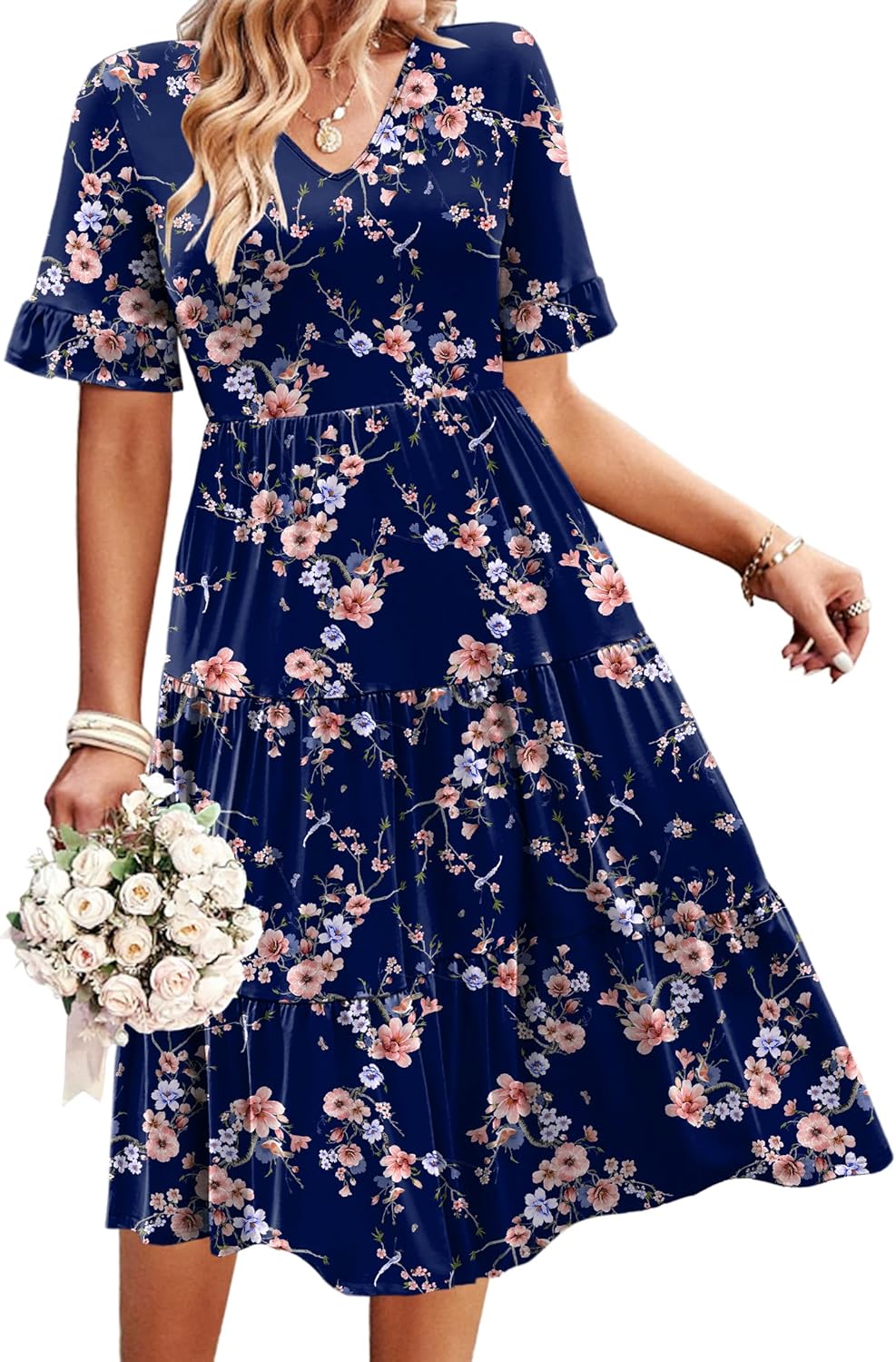 IN'VOLAND Plus Size Women's Casual Floral Dress Summer Short Sleeve A-Line Midi Dresses Flowy Beach Sundress with Pockets