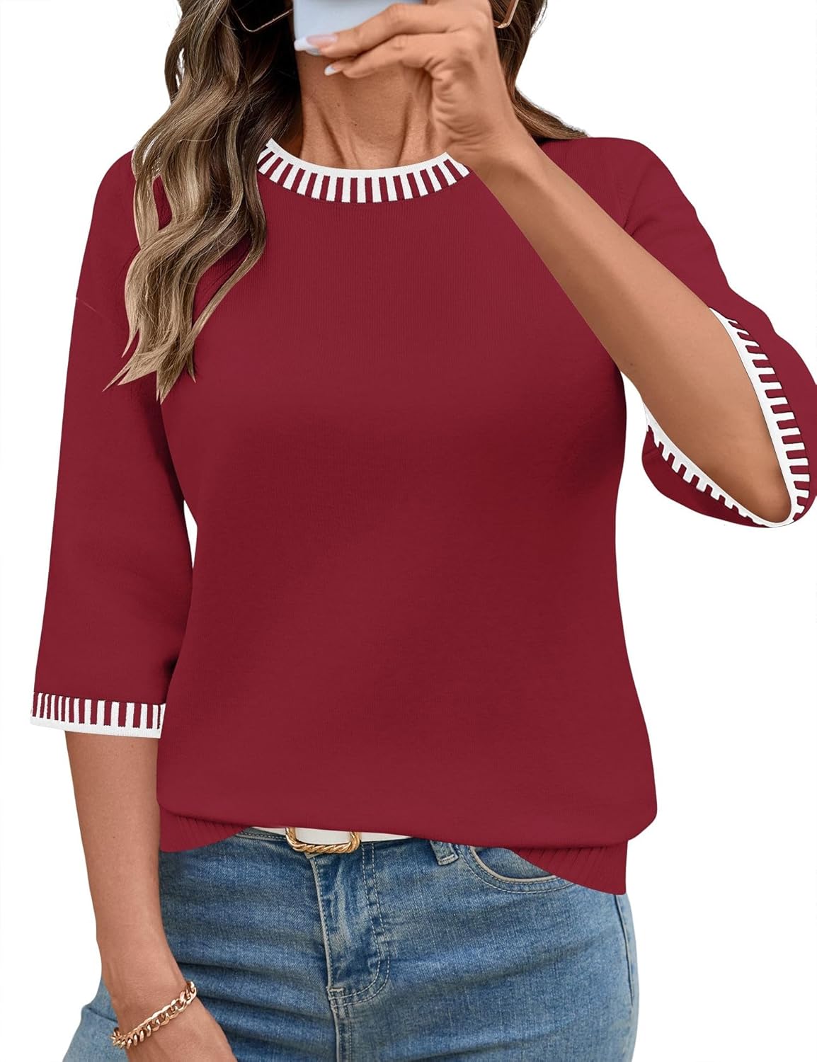 LOMON Womens Sweaters Casual Fall 2025 Crew Neck Striped 3/4 Sleeve Lightweight Knit Trendy Pullover Sweater Tops S-XL