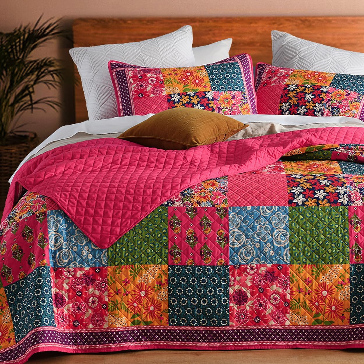 - [Stylish & Decorative]: Featuring a beautiful floral patchwork design, this quilted comforter set adds a touch of bohemian elegance to any bedroom. The print allows you to switch up your bedroom decor with ease, offering two stylish looks in one.