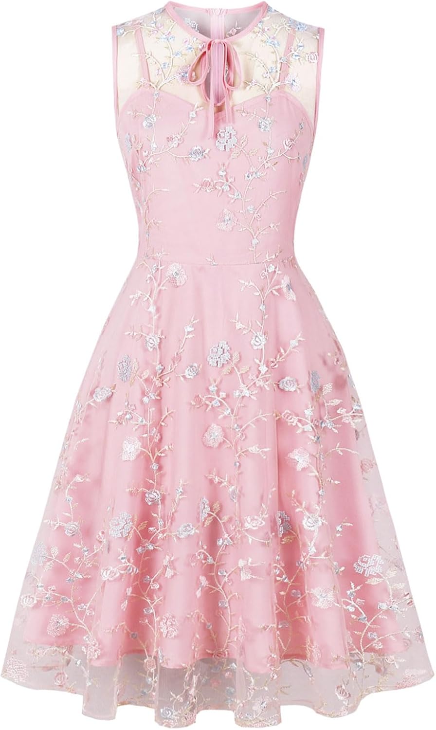 Sleeveless Floral Embroidery Dress for Women Flower Embroidery Tulle Prom Dress Mesh Illusion Keyhole Wedding Party Tea Dress