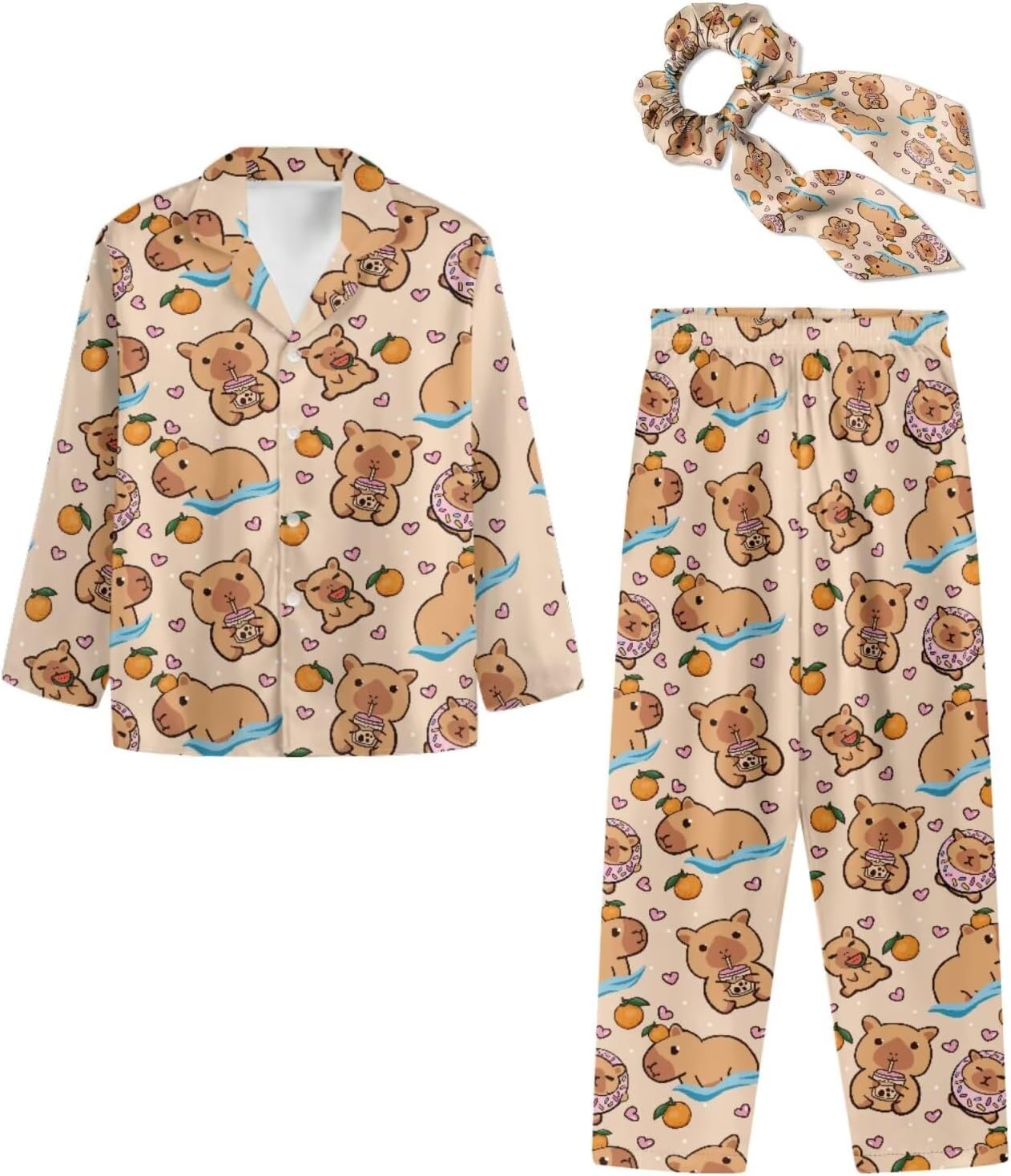 Womens Pajamas 3-Piece Sets Long Sleeve Button Up Pajama Set Loungewear Pjs with Bow Hair Band