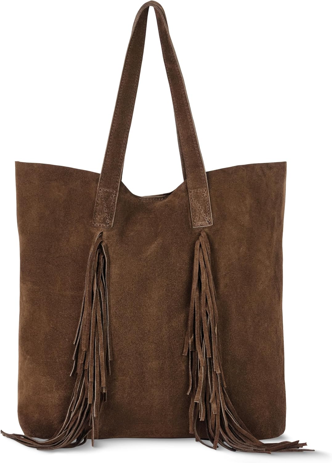 Italian Genuine Suede Tote Bag for Women with Fringe Detail | Medium Top Handle Han...