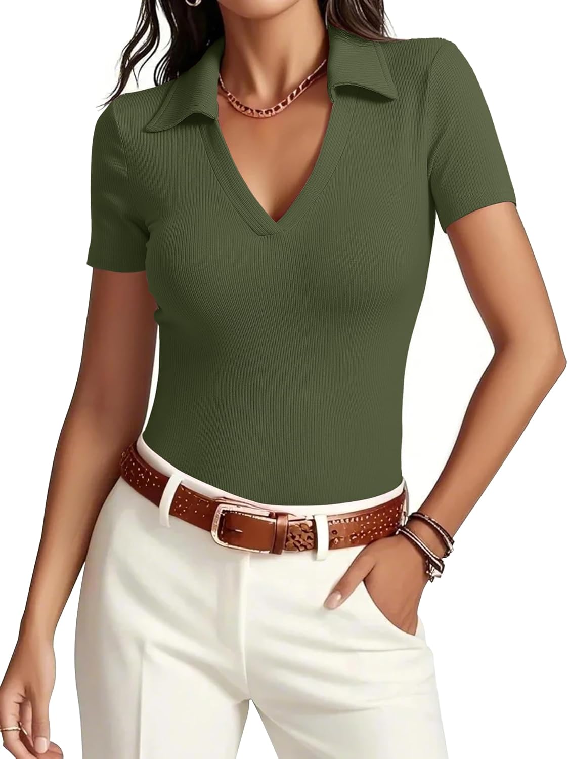 Womens Short Sleeve Business Casual Tops Summer V Neck Polo Work Shirts 2025 Fitted Basic Collared Shirt