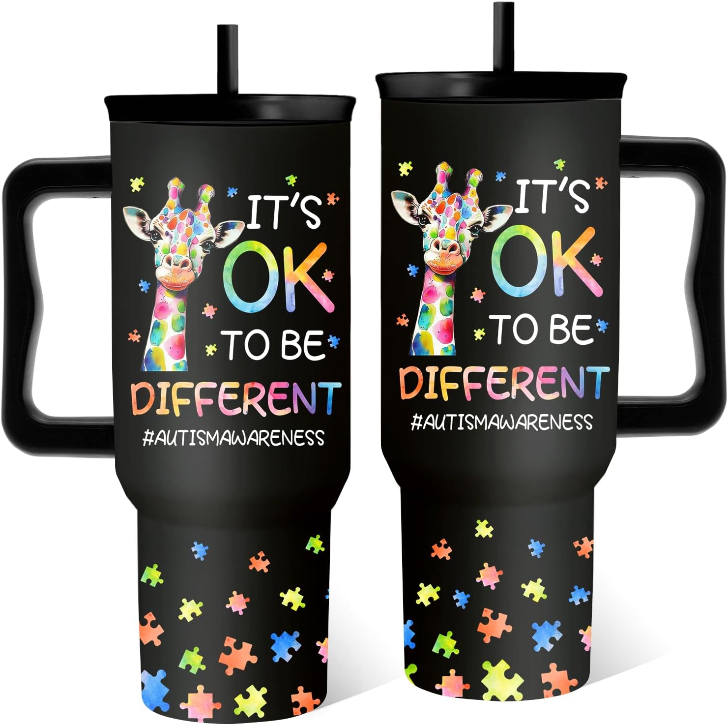 Autism Tumbler 40 Oz, Autism Awareness Tumbler With Handle, It's Ok to Be Different Giraffe Cup, Birthday Christmas Gifts For Autistic Person, Autismo Gift Black