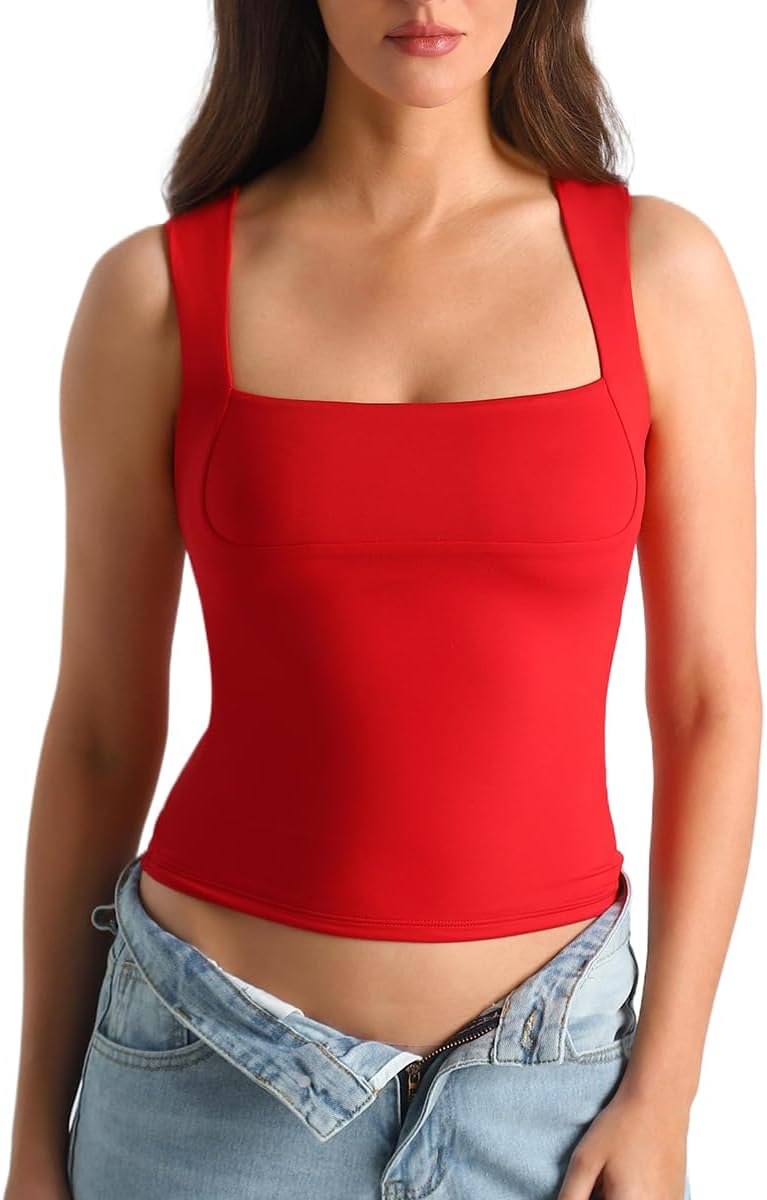 HOYAYO Women's Slim Fit Double-Layer Tank Top Square Neck Sleeveless Basic Fitted Tee Shirt