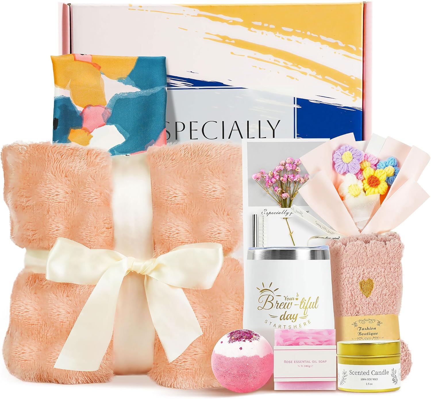 - 【Get Well Gifts for Women】 Mesenda’s luxury care package is designed to comfort women recovering from surgery, illness, or stress. Includes a ultra-soft bubble fleece blanket, insulated tumbler, fuzzy socks, 2.5 oz lavender scented candle, bath bombs, handmade soap, silk scarves, knitted bouquet of small flowers, and one personalized greeting card—perfect as surgery recovery gifts for women or chemo care package for women