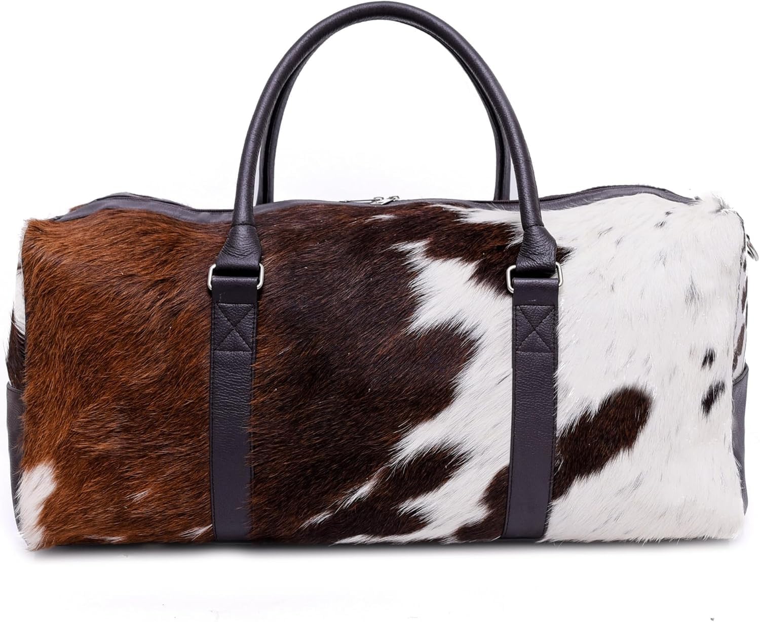Luxurious Cowhide Duffel Bag for Men's and Women's - Large Size Unisex Travel Duffle Bag, Unique Leather Gym Bag Weekender Overnight Premium Quality Cow Hair on Duffle (Brown & White)