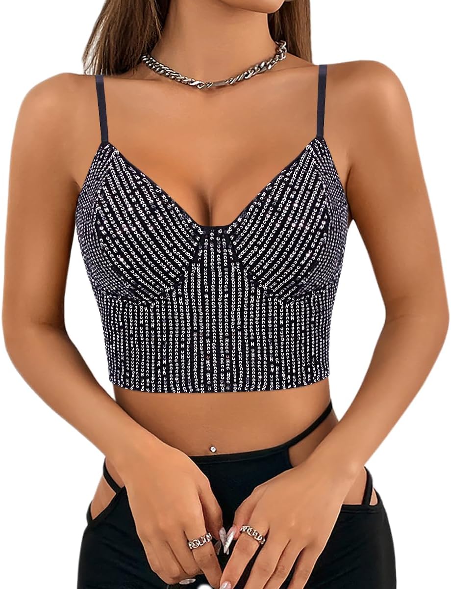 Vimoisa Women Reflective Metallic Tank Top Bustier Spaghetti Strap Crop Top Tight Sleeveless Tube Top Vest Blouse
