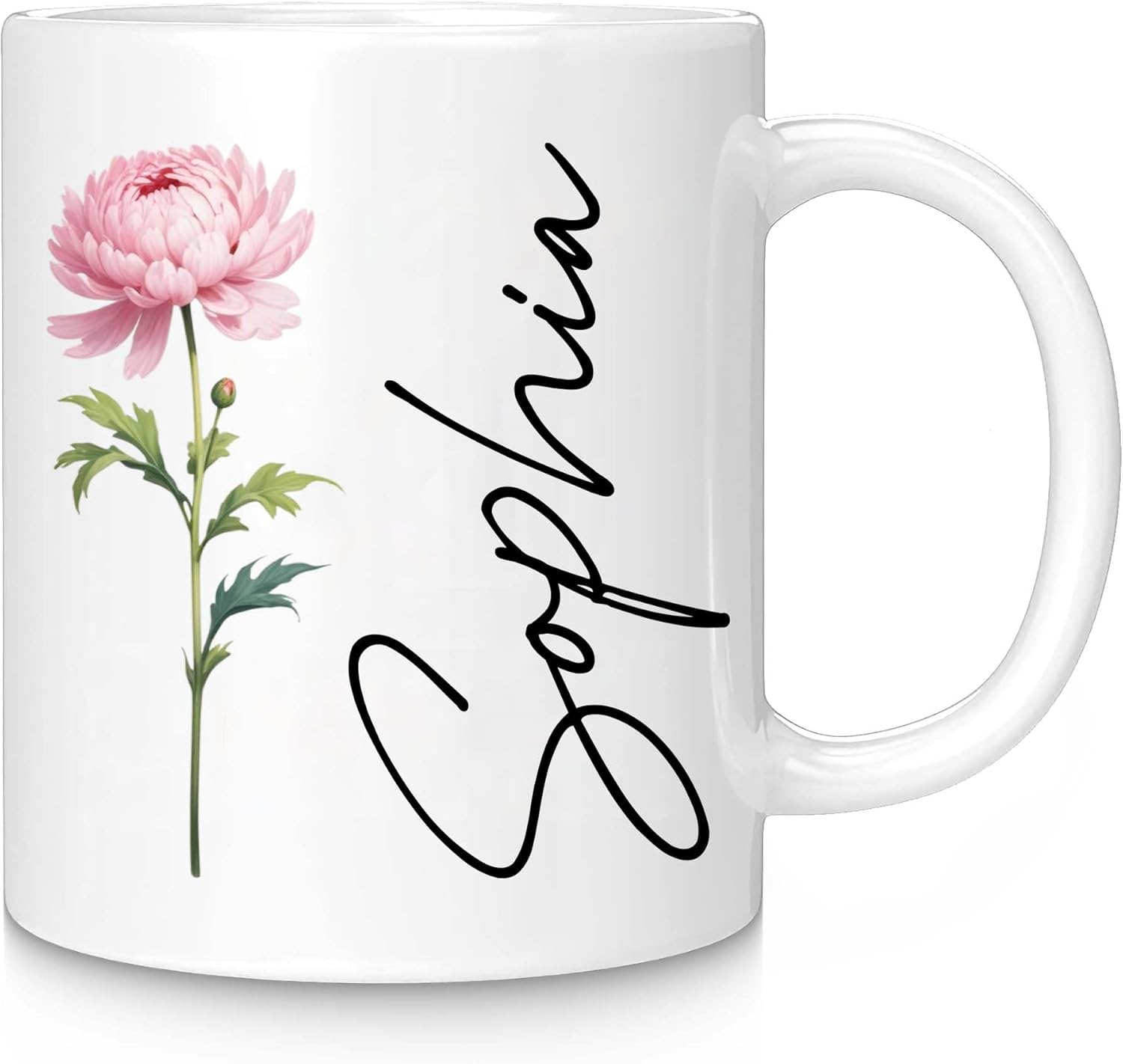 Custom Coffee Mug with Birth Flower & Text, 11oz Ceramic Personalized Mugs for Women, Customized Birthday Gifts for Mom Sister Coworker Best Friend (Flower & Name)