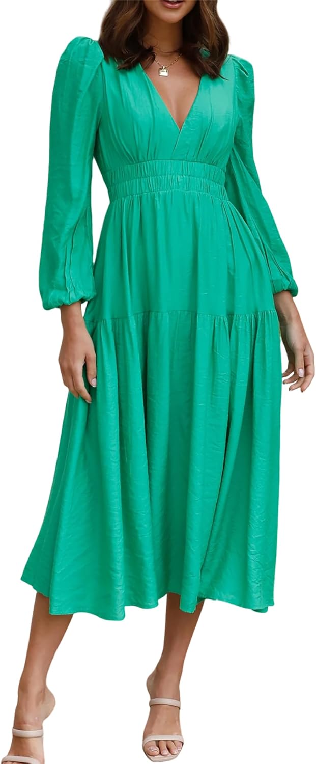 R.Vivimos Womens Casual Long Sleeve Midi Dress Deep V Neck Elastic Waist A-Line Tiered Flowy Elegant Dresses