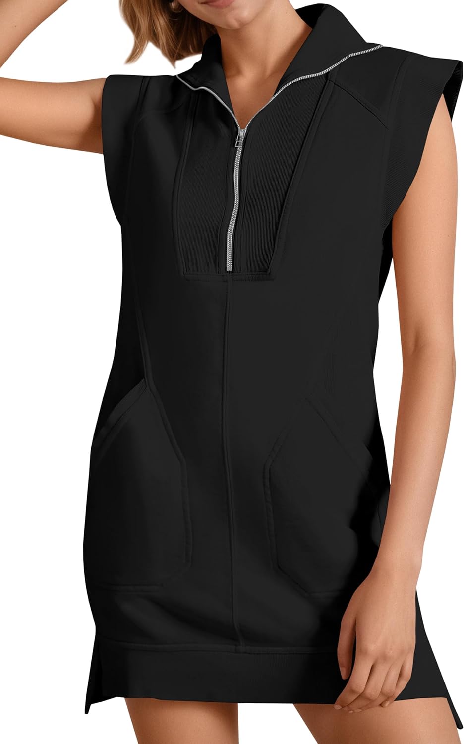 Fisoew Womens Summer Half Zip Sweatshirt Dresses V Neck Collared Sleeveless Workout Tunic Mini Dress