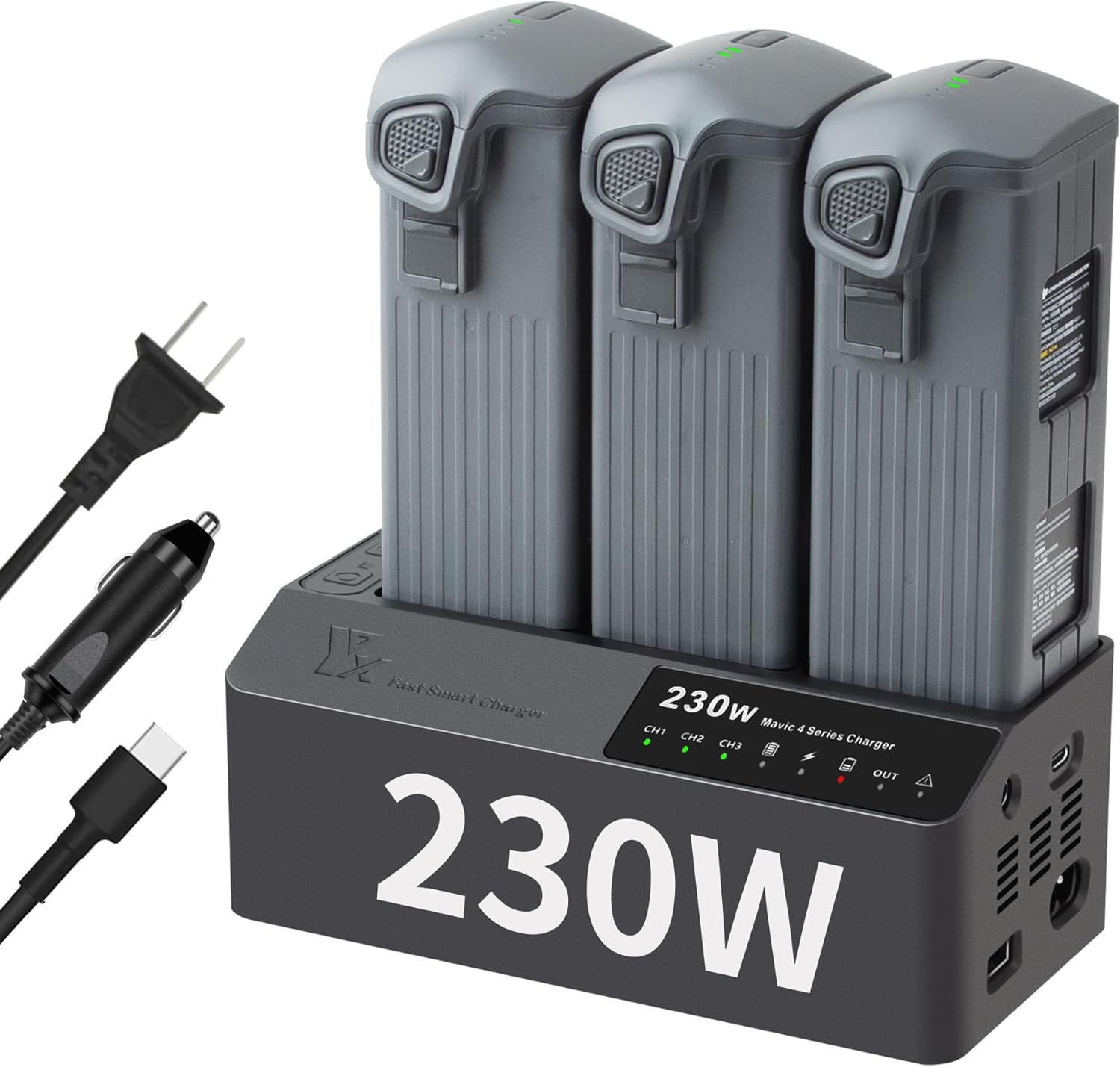 - 230W Fast Charge: Support 1-3 batteries and remote controller charging at the same time.Charging time: Quick charge mode,3 batteries about 70 mins;Full charge mode,2 batteries about 55 mins, 3 batteries about 75 mins