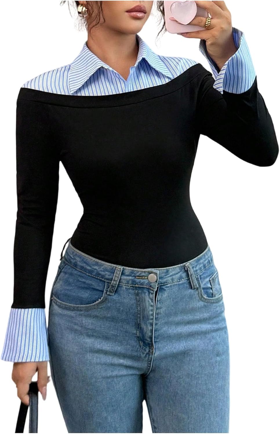 Milumia Women's Striped Collared Long Sleeve T Shirt Y2k Slim Fitted 2 in 1 Casual Work Tops