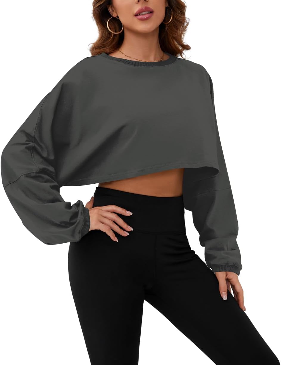 Meladyan Women Long Sleeve Crewneck Crop Top Tee Shirt Sweatshirt Casual Solid Loose Fit Workout Cropped Pullover Tshirt