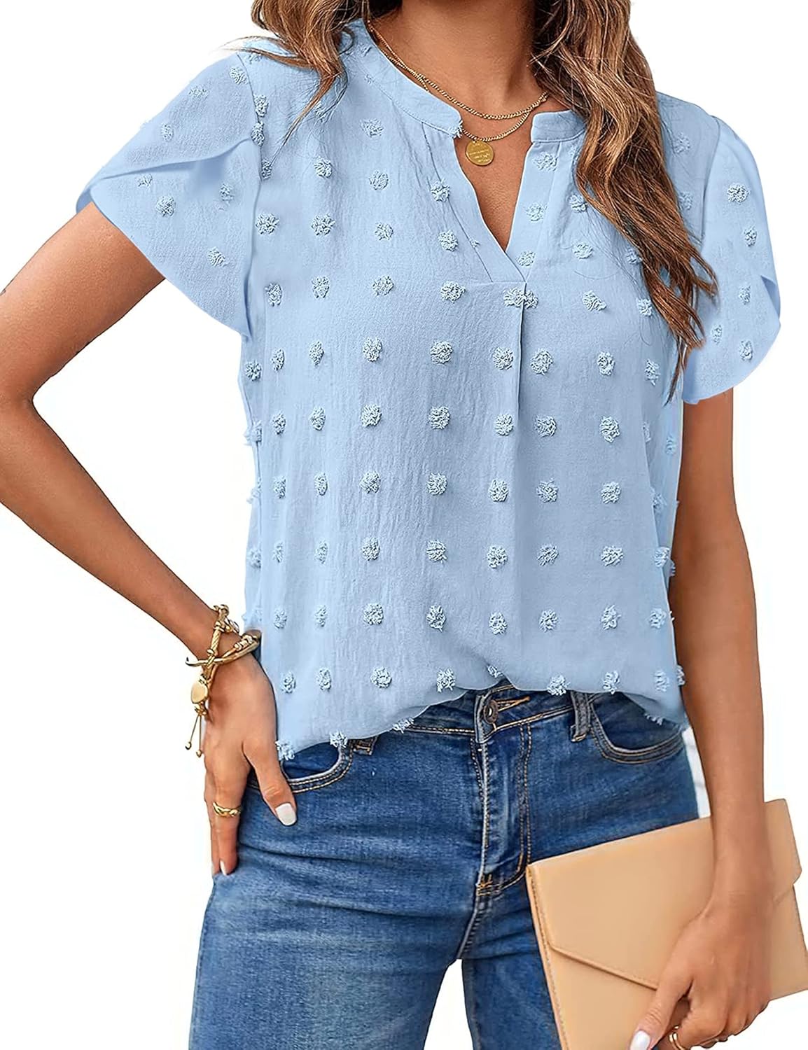 SESERAGI Blouses for Women Fashion 2023 Summer Loose Fit Flowy Shirts Dressy Casual Petal Short Sleeve Cute Swiss Dot Tops