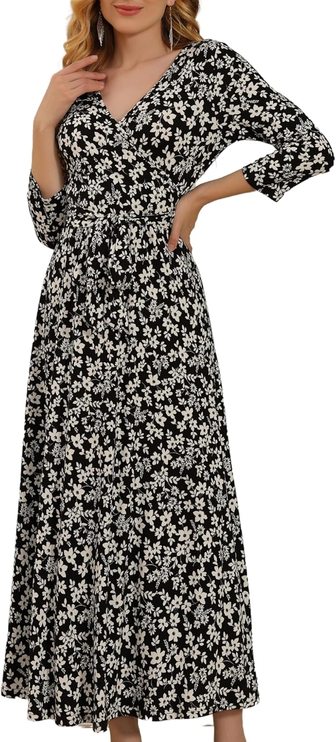 Aphratti Women's Maxi Dress with Sleeves - Faux Wrap Soft Stretchy Flowy Long Dress for Everyday Casual Outfits