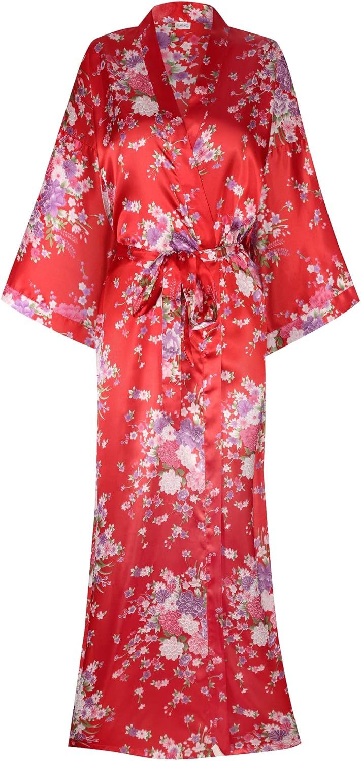 Women's Long Kimono Robes Silky Floral Bathrobe with Blossoms Printed Bridesmaid Wedding Nightgown