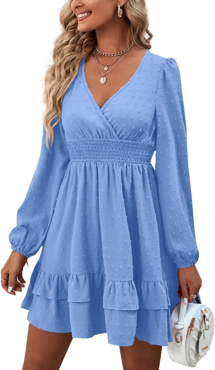 Rooscier Women's Wrap V Neck Swing Ruffle Swiss Dots Long Sleeve Mini Dress