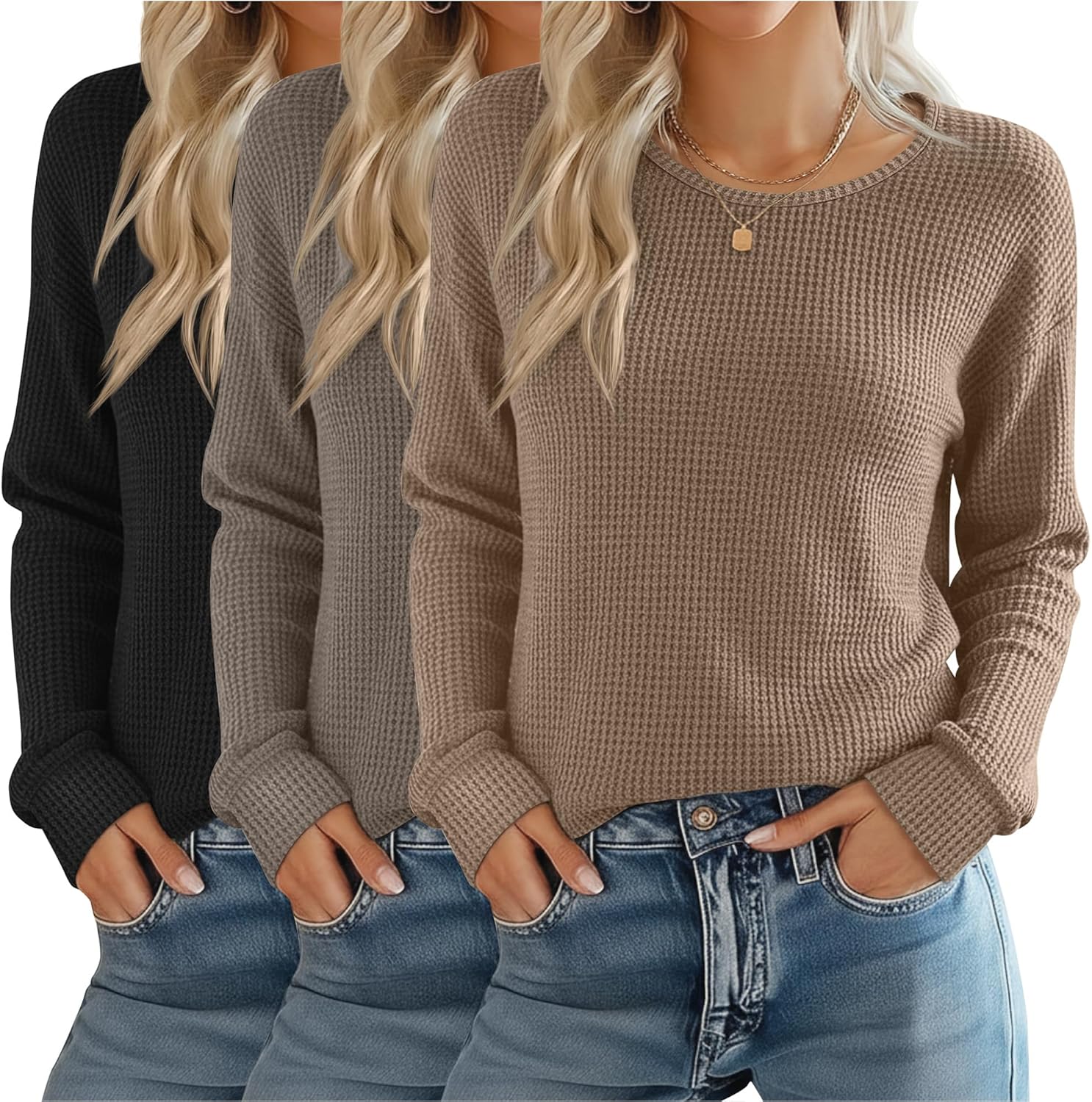 3 Pack Women's Waffle Knit Long Sleeve Shirts, Crew Neck Slim Fit Thermal Tops Casual Stretch Basic Pullover