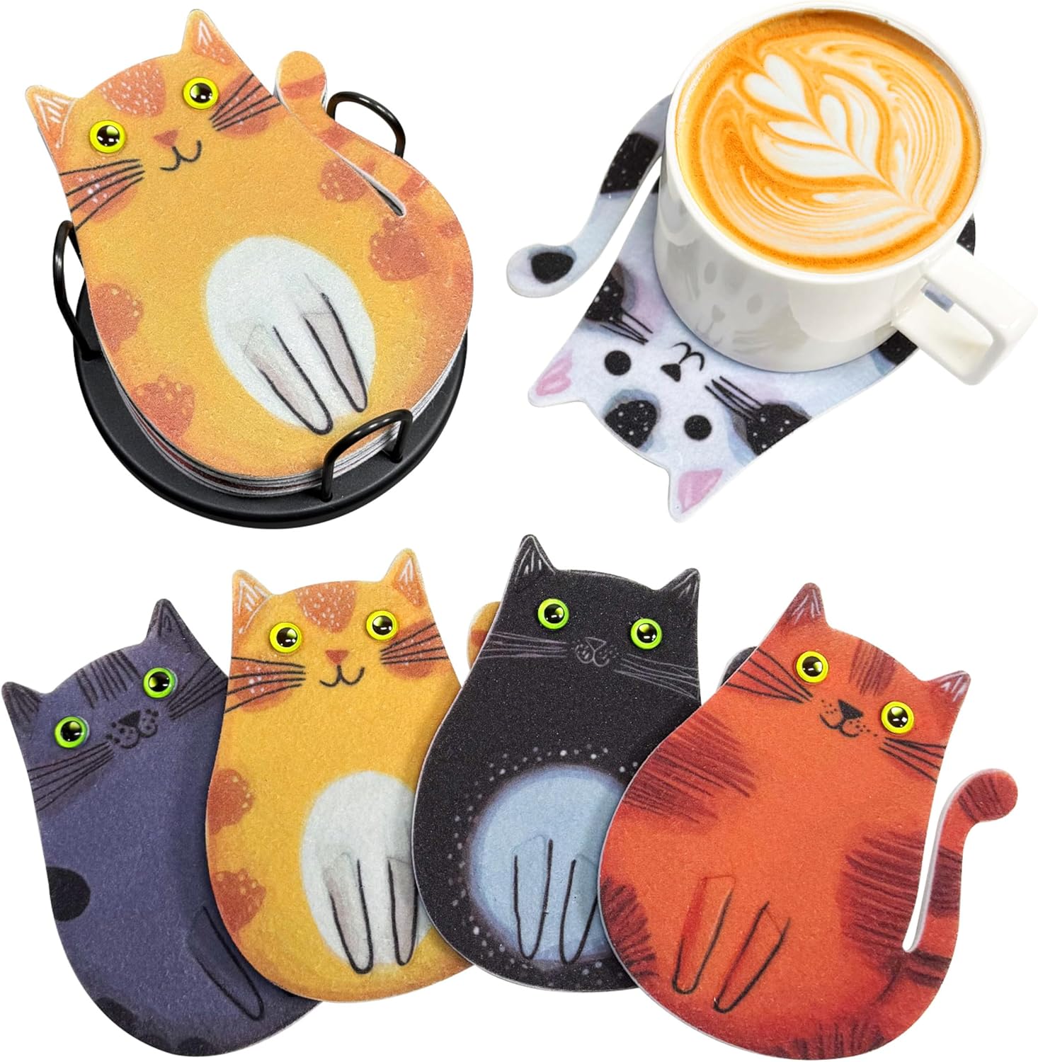 Cartoon Cat Coasters 6-Pack, Super Cute Absorbent Felt Coasters for Drinks, Non-Slip Scratch Protection for Wood Tables, Washable Rugged Coaster Set with Holder, Fun Gift for Cat Lovers (6PC)