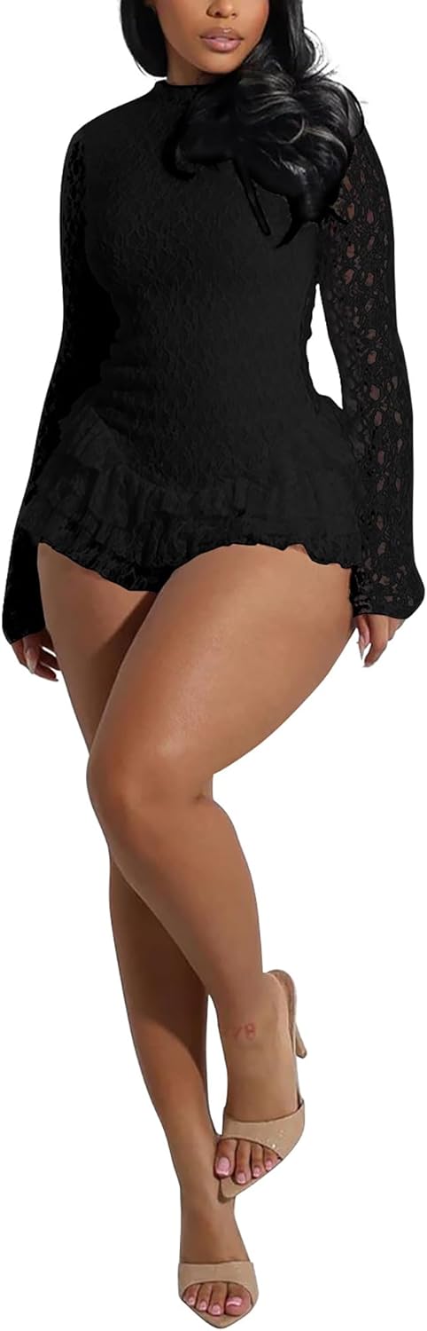 Sexy Backless Jumpsuit for Women Lace Long Sleeve Romper Ruffle Trim Short Jumpsuit Going Out