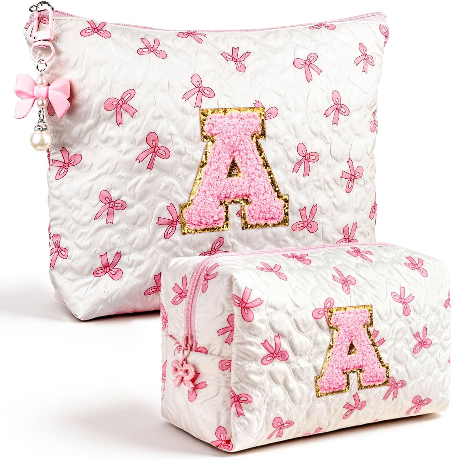 Initial Makeup Bag, Valentines Day Gifts for Women Teens Girls Birthday Gift Personalized Bow Cosmetic Bag, Quilted Cosmetic Travel Toiletry Pouch, Cute Makeup Organizer Teen Girl Gifts Trendy Stuff A