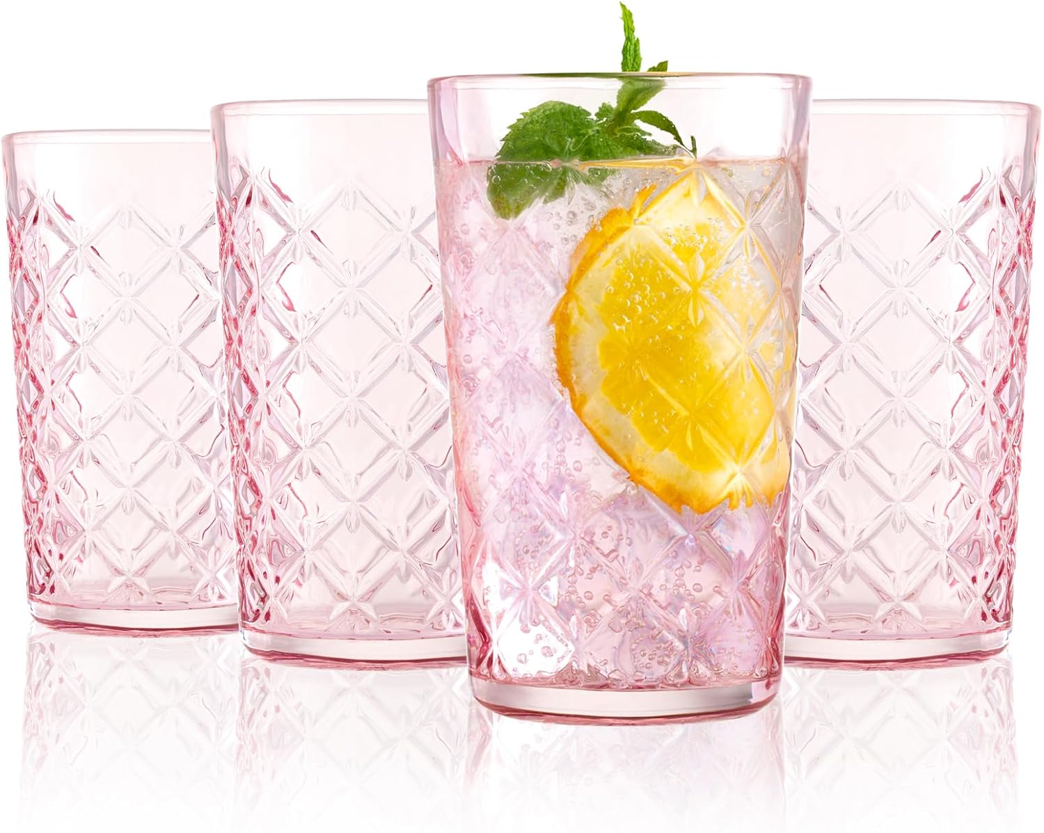 Drinking Highball Glasses Set of 4, Vintage Cross Hatch Glass Cups, 15.5oz Tall Drinking Water Glasses, Dishwasher Safe Pink Glass Tumbler Glassware for Water, Juice, Cocktail, Coffee, Whiskey