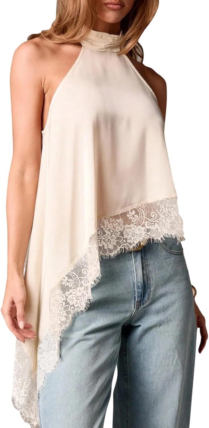 Women Y2k Mock Neck Halter Top Satin Lace Asymmetrical Hem Tank Tops Sleeveless Elegant Going Out Crop Top