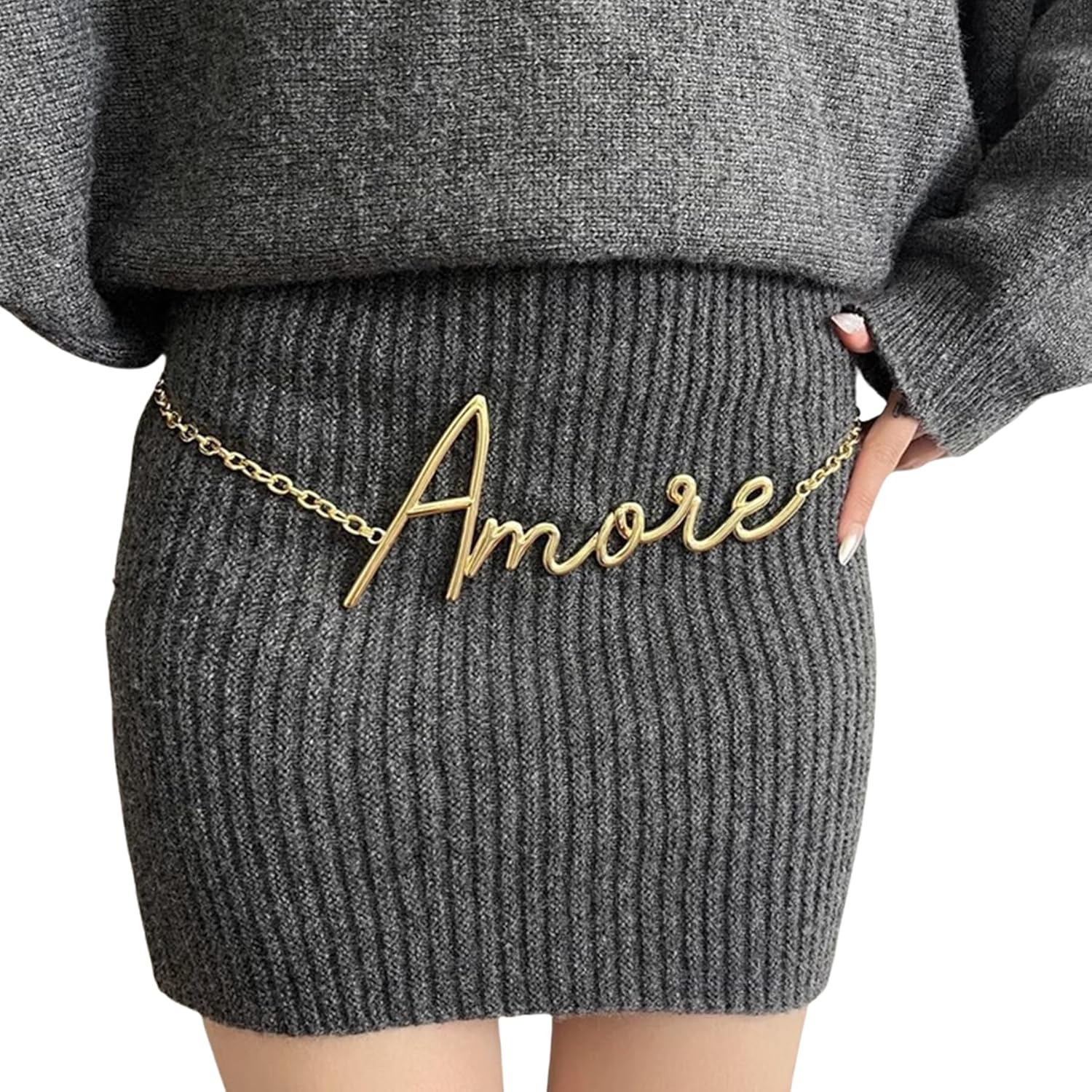 AIBEARTY Women's Vintage Gold Letter Waist Chain Fashion Adjustable Minimalist Metal Body Belt for Dress Pants