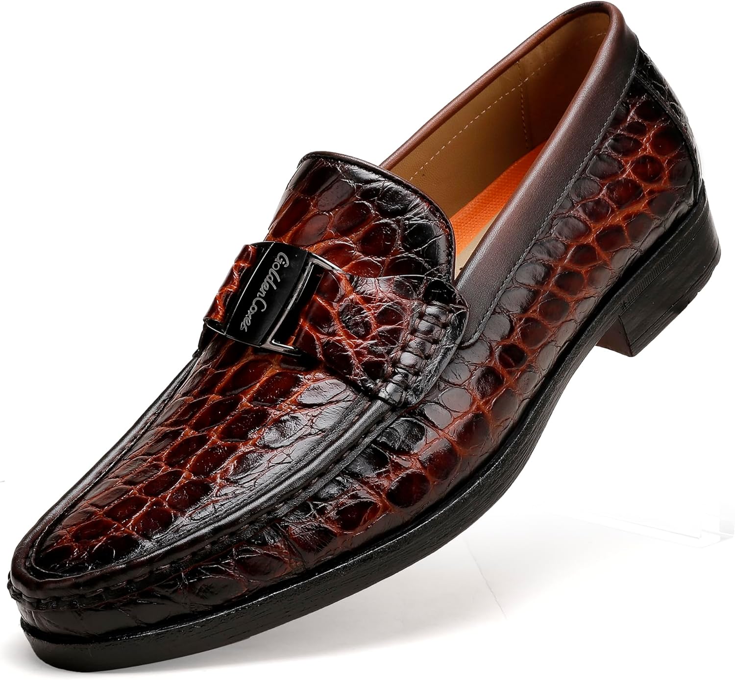 Classic Mens Leather Dress Shoes, Luxury Crocodile Printed Slip on Loafer with Matel Buckle Penny Shoes for Mens