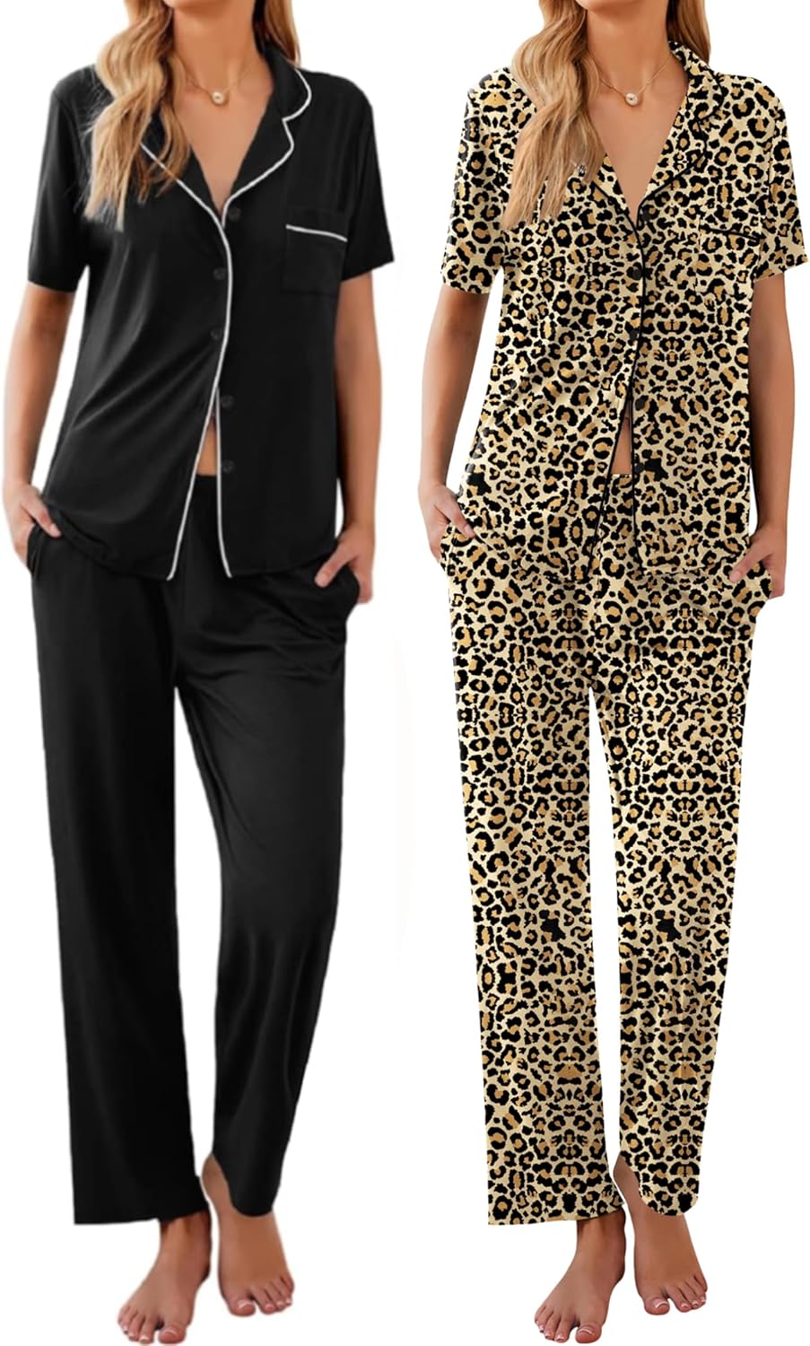 Ekouaer 2 Pack:Womens Pajamas Short Sleeve Pjs Notch Collar Button Up Loungewear Cozy Sleepwear Sets