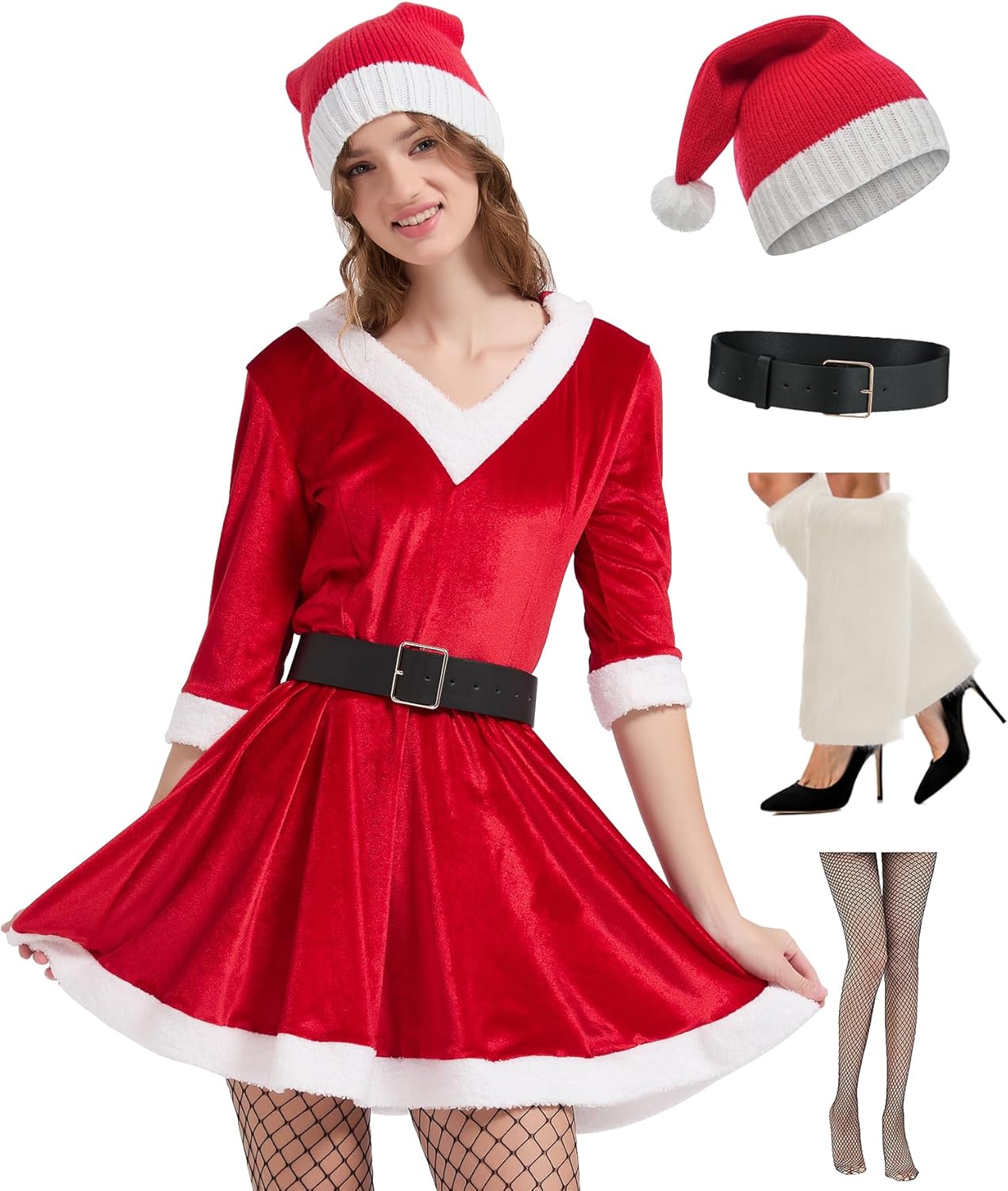 ZeroShop Mrs Claus Costume Adult Women, 2025 Christmas Santa Outfits Dress With Hat Belt Fur Leg Warmers Fishnet Stockings