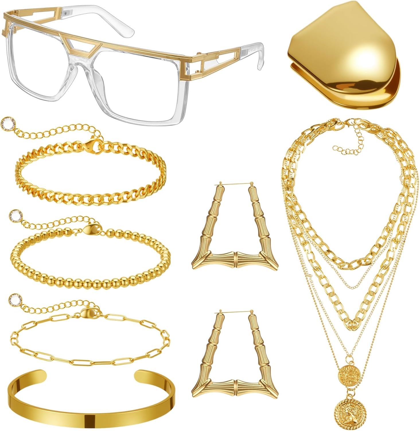 Gejoy 8 Pack Halloween 90s 80s Accessories Kit 90s Outfit for Women Men Rapper Glasses Gold Layered Necklaces Stacking Bracelet Bamboo Hoop Earrings Gold Plated Hip Hop Teeth for Old School Party