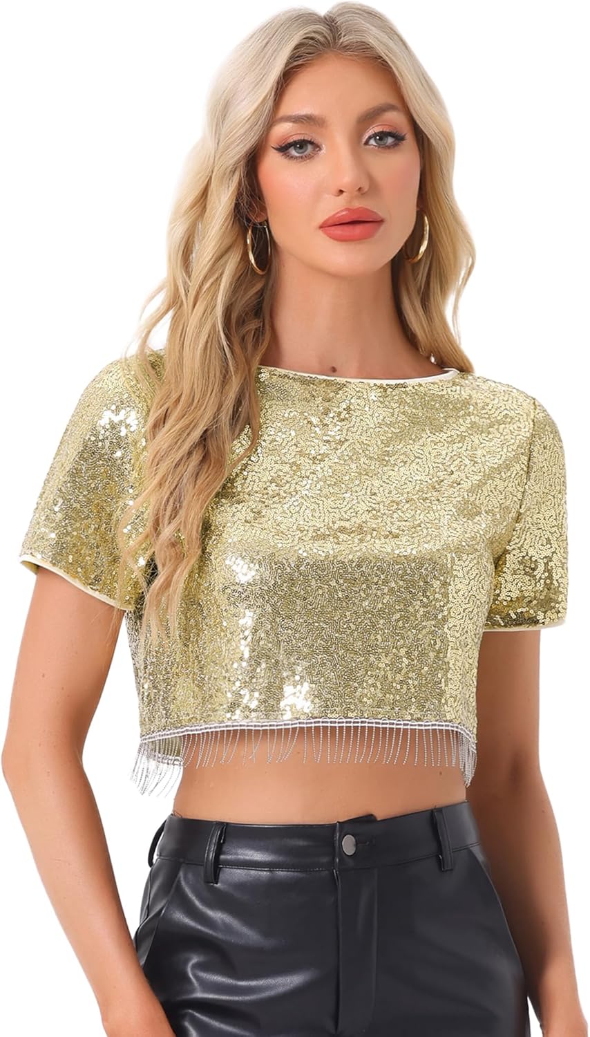 Allegra K Sequin Tops for Women's Glitter Short Sleeve Cropped Round Neck Tassel Cocktail Party Sparkly Top