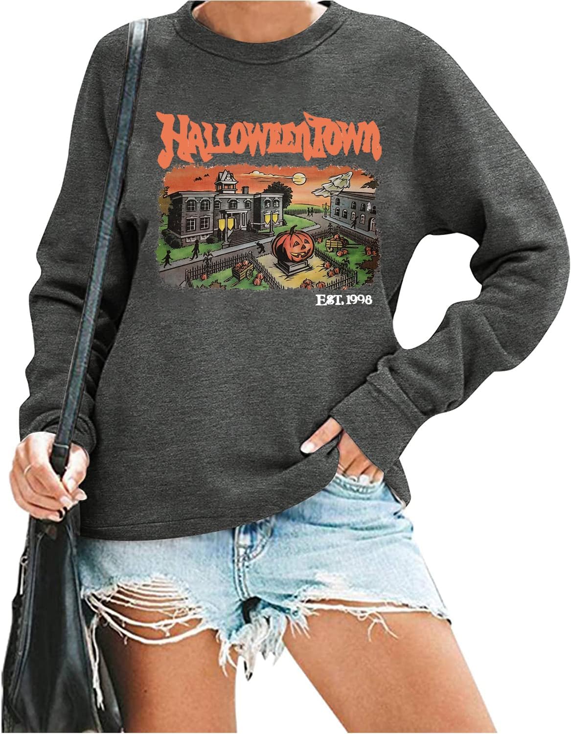 QIANRUO Halloween Town Est 1998 Sweatshirt Women Halloween Horror Spooky Graphic Tees Casual Fall Long Sleeve Pullover Tops