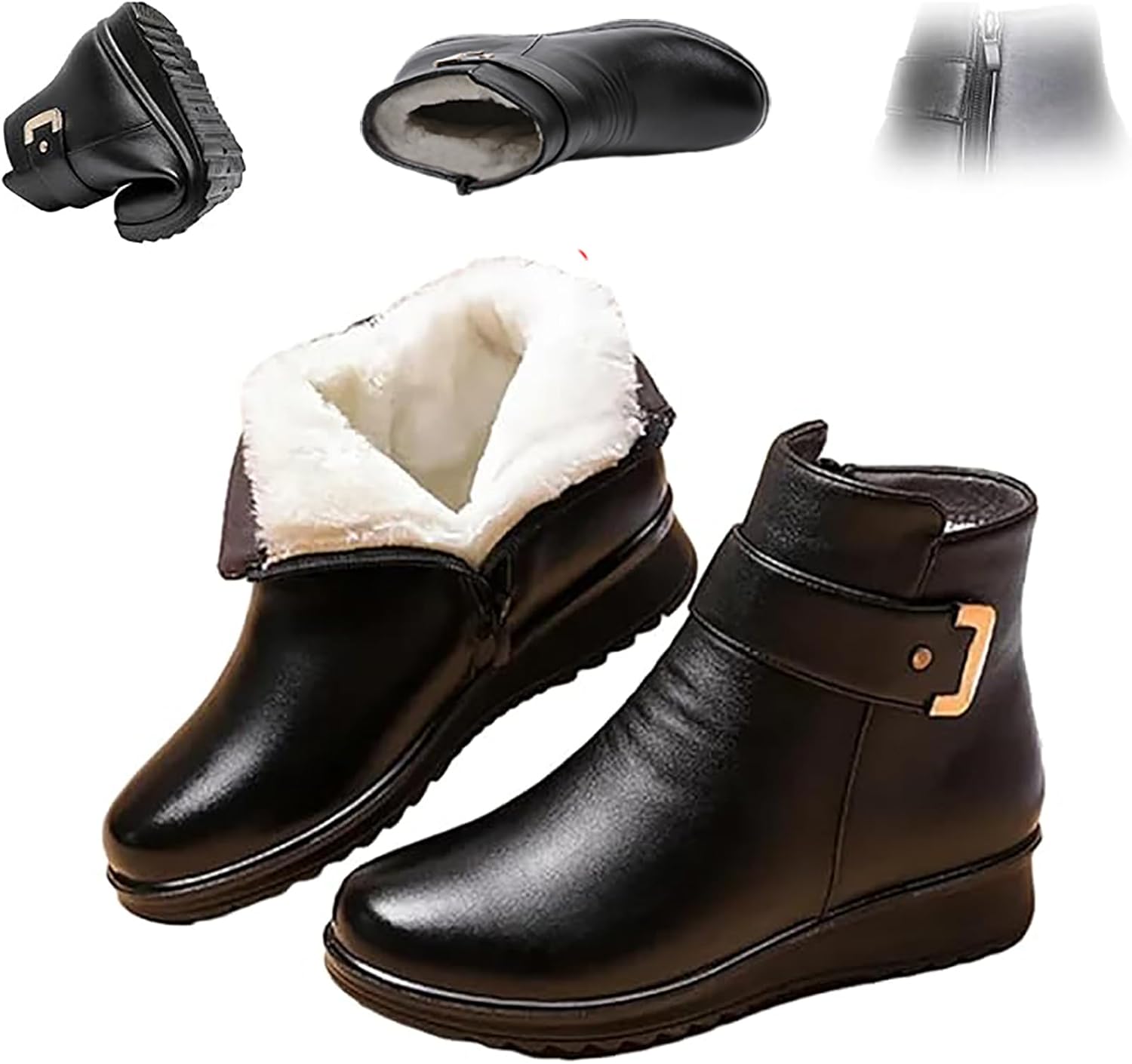 Women's Metal Buckle Genuine Leather Wool Orthopedic Boots,Winter Warm Slip On Fur Lined Snow Boots with Side Zipper