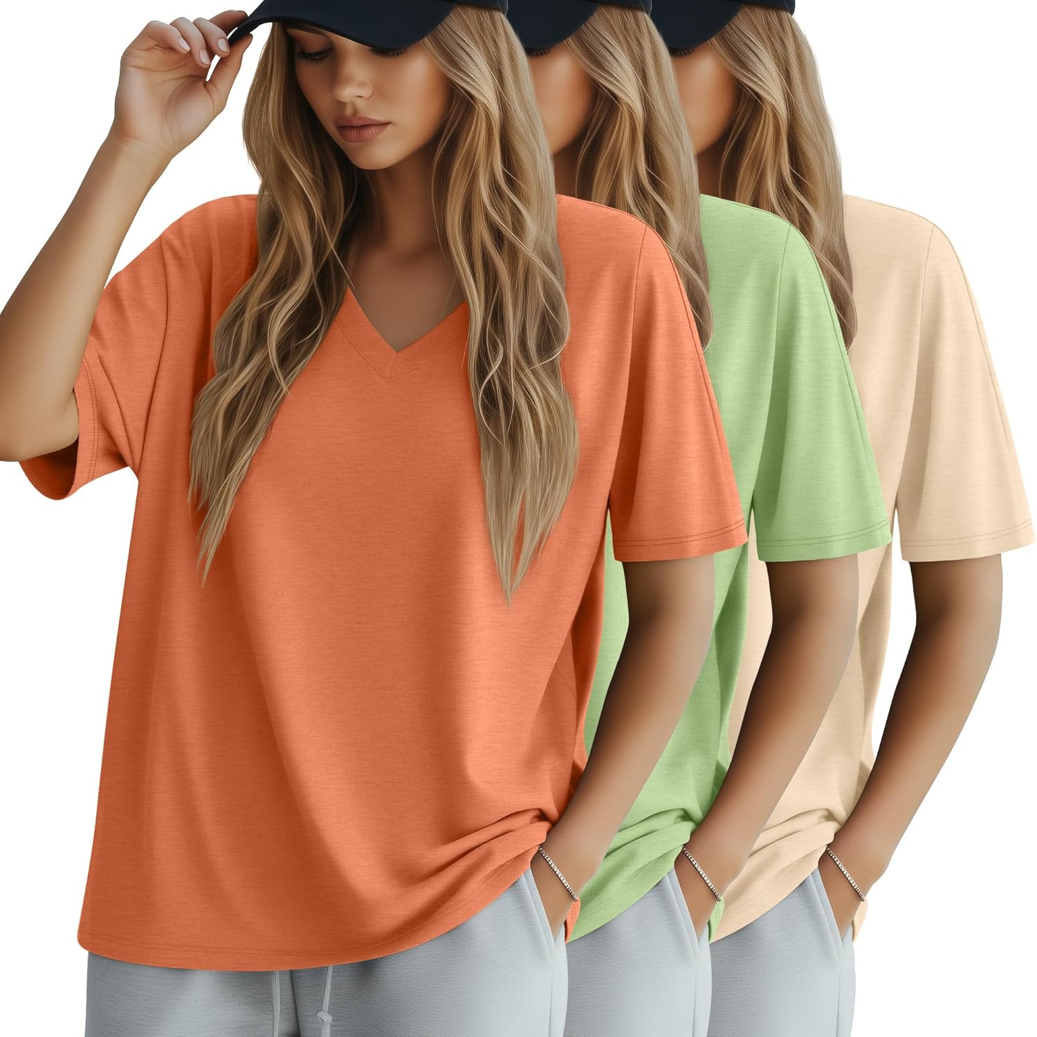 Huukeay 3 Pack Women's Oversized Cotton T-Shirts V Neck Loose Fit Casual Workout Tees Soft Short Sleeve Tops