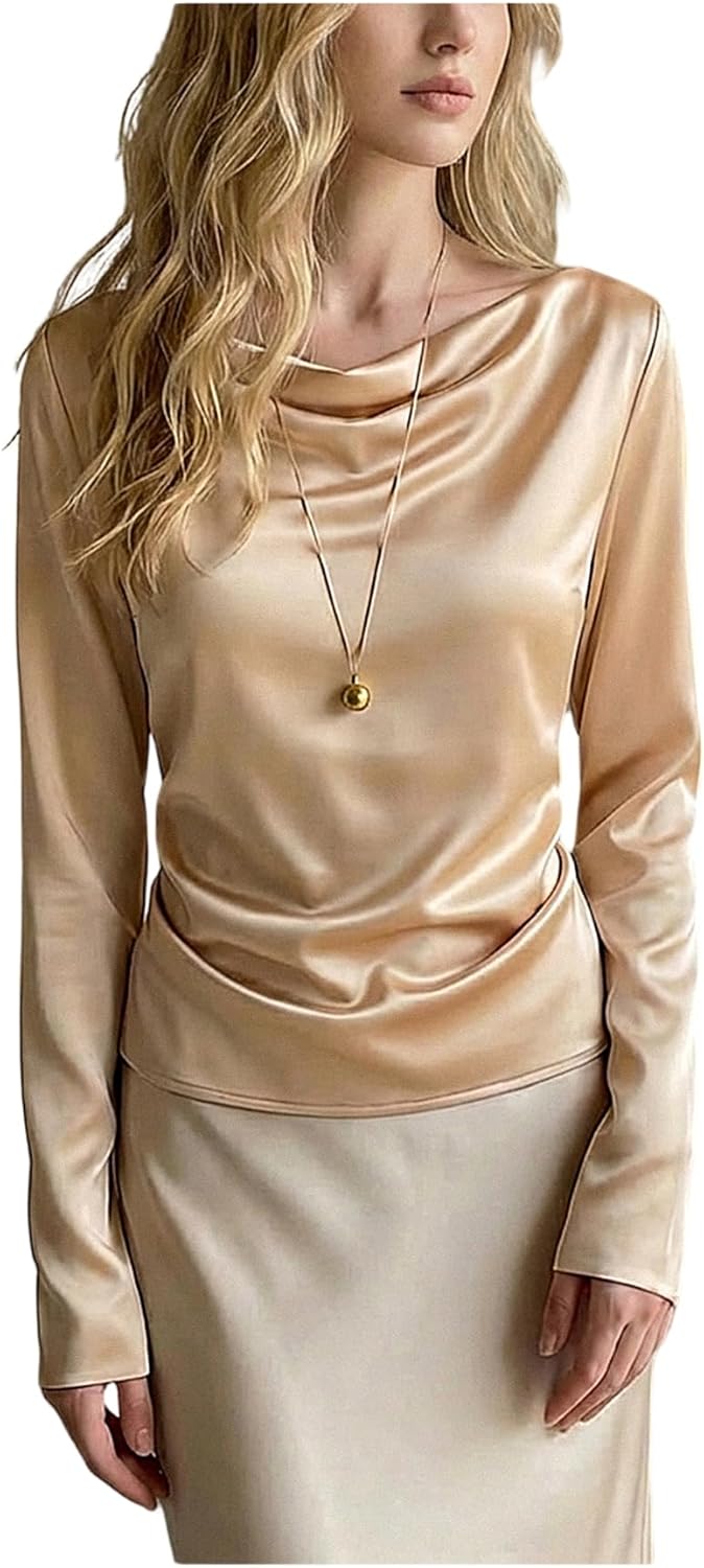 Women's Elegant Satin Cowl Neck Blouse Dressy Casual Long Sleeve Fall Work Tops