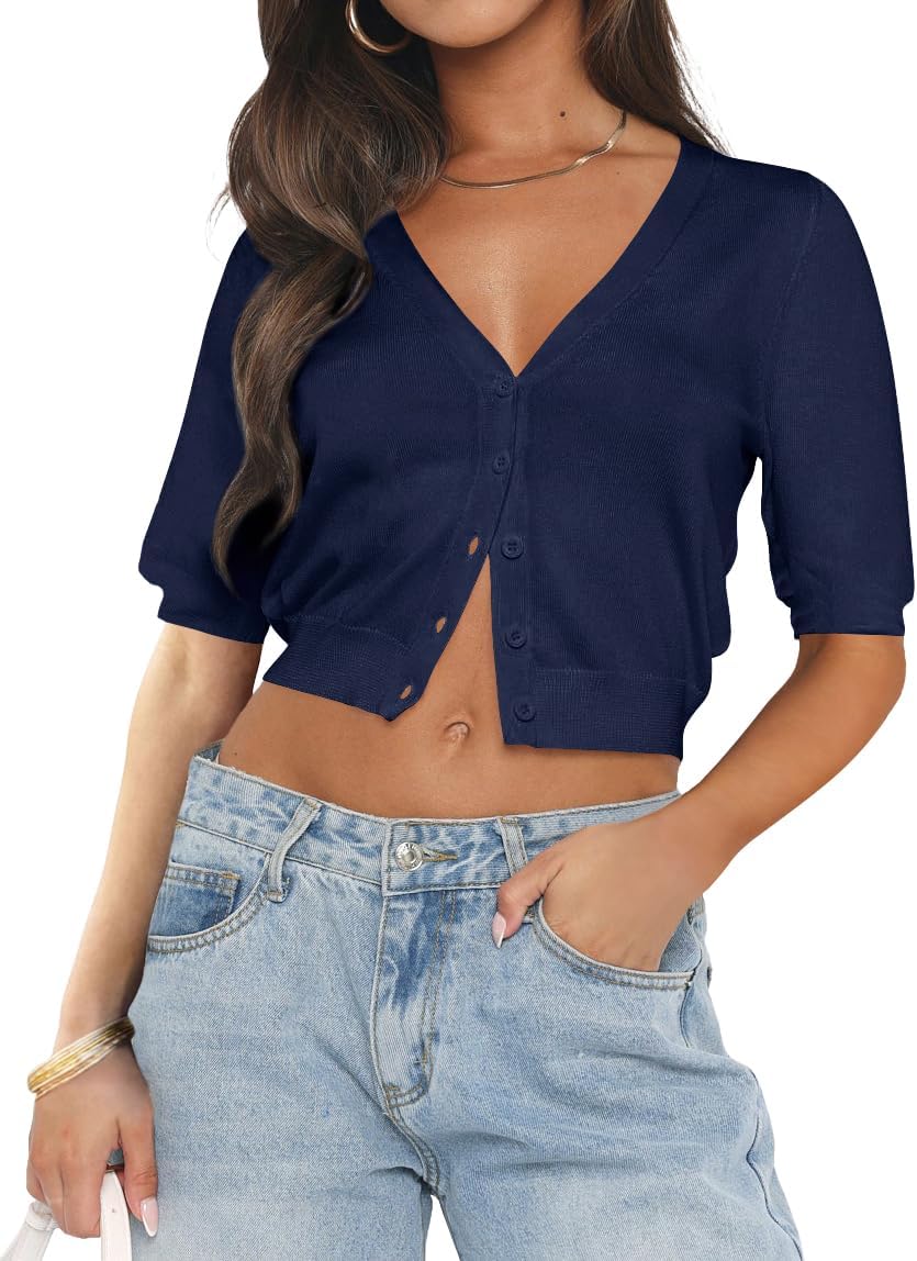 Ezbelle Summer Women's V Neck Cardigan Sweater Knit Sexy Short Sleeve Tops Crop Button Down Shirt 2026