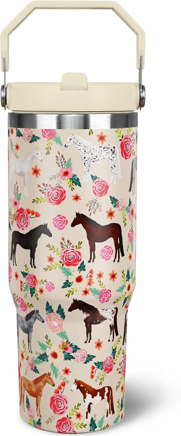 30 oz Horse Tumbler with Handle and Flip Straw, Vacuum Insulated Water Bottle Stainless Steel, Leak Proof Travel Coffee Mug Gifts for Horse Lover, Cute Floral Cup for Home Office Car Outdoors Sports