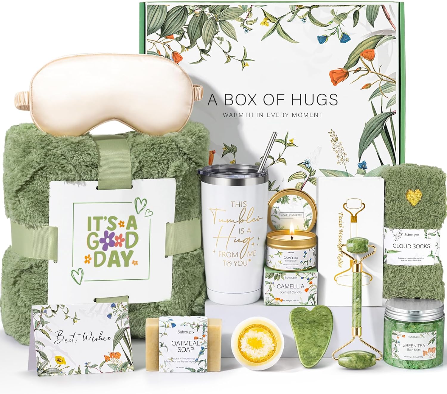 - 【LUXURY CARE PACKAGE FOR WOMEN】Self-care essentials she’ll love. Inside: (1) Flannel Blanket, (2) 20oz Insulated Tumbler, (3) Gua Sha & Jade Roller Set, (4) Silk Eye Mask, (5) Fuzzy Socks, (6) Green Tea Bath Salts, (7) 4oz Scented Candle, (8) Oatmeal Soap, (9) Bath Bombs, (10) Greeting Card, (11)Beautiful Gift Box. Perfect for milestones or anytime she needs extra comfort and healing—this gift box is a thoughtful birthday or recovery gift, and a beautiful way to say “I’m thinking of you.”
