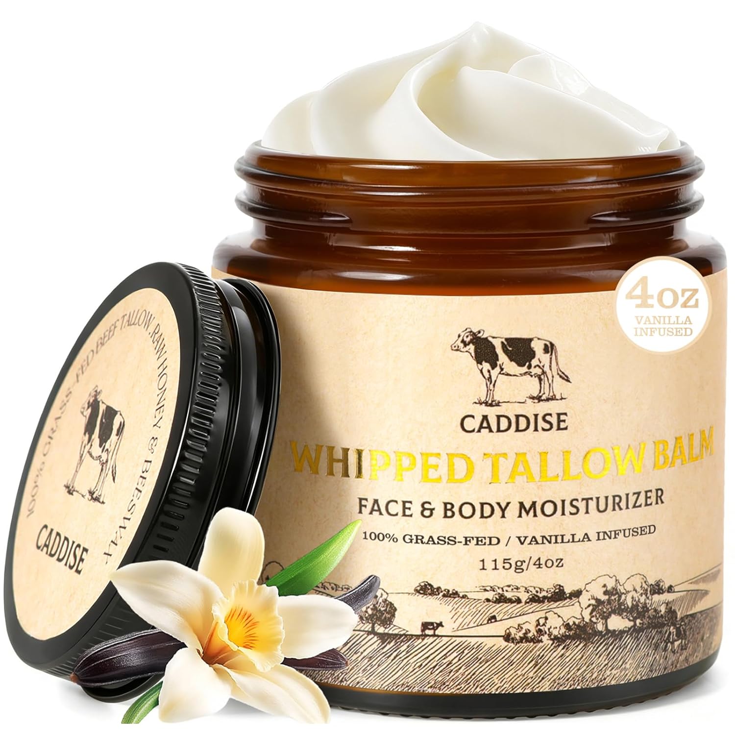Whipped Beef Tallow for Skin–100% Grass-Fed Handmade Cream Moisturizer for Face & Body, Natural with Honey, Shea Butter, Jojoba Oil, Non-Greasy, Nourishing for Men, Women, Kids, 4 Oz (Vanilla)