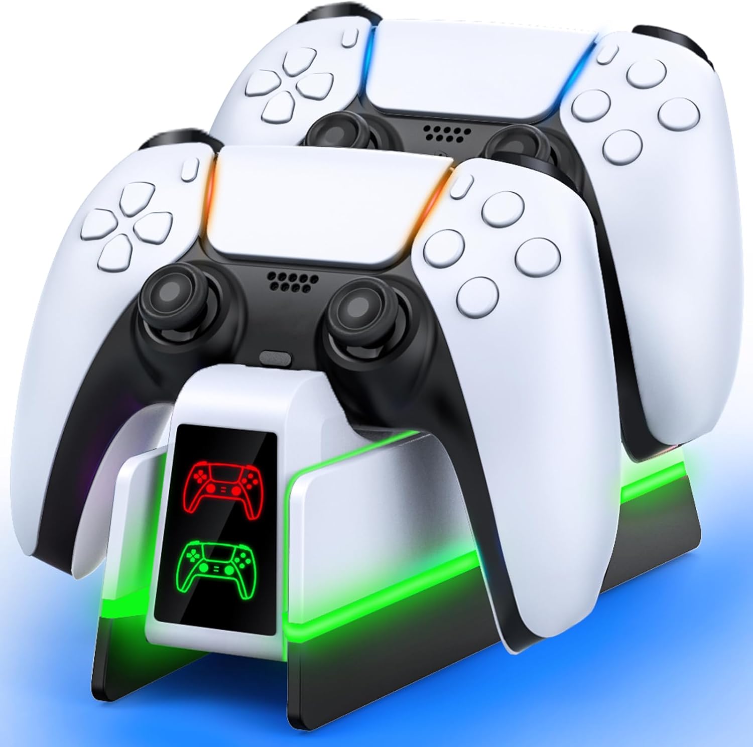 - MORE THAN JUST A PS5 CONTROLLER CHARGING STATION: The ZRZLMVP ps5 charging station is more than just a ps5 controller charger for fast and safe charging of your ps5 controller, it can also be a ps5 controller holder stand, perfect for storing your 2 ps5 controllers and keeping your ps5 gaming area clean and organized. LED light can bring you into the dazzling world with one click, and become your PS5 accessories kit fashion item. WHAT YOU GET: 1 X PlayStation 5 controller charger, 1 X Type-C cable, 1 X User's manual, 12-month quality support, 7/24h friendly customer service